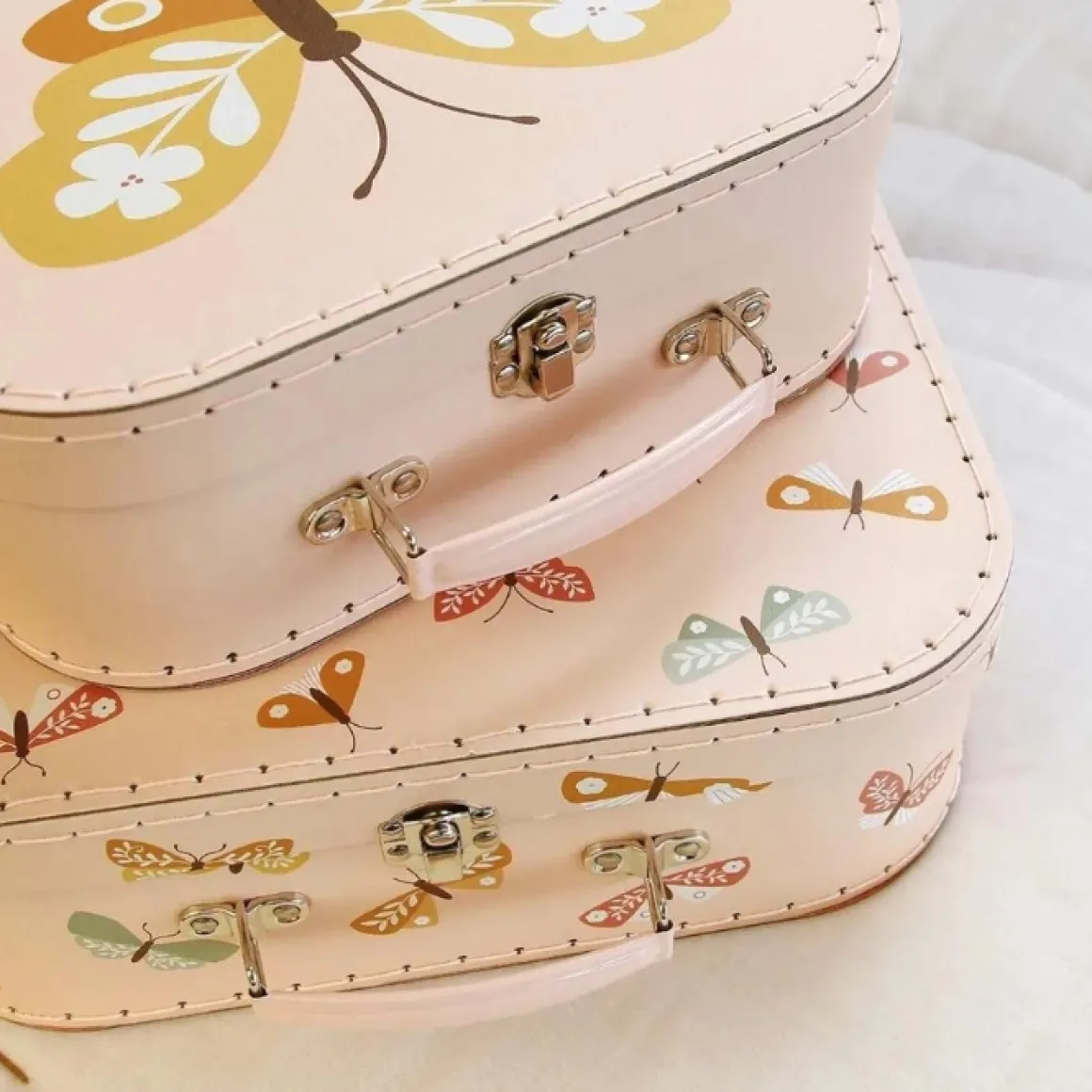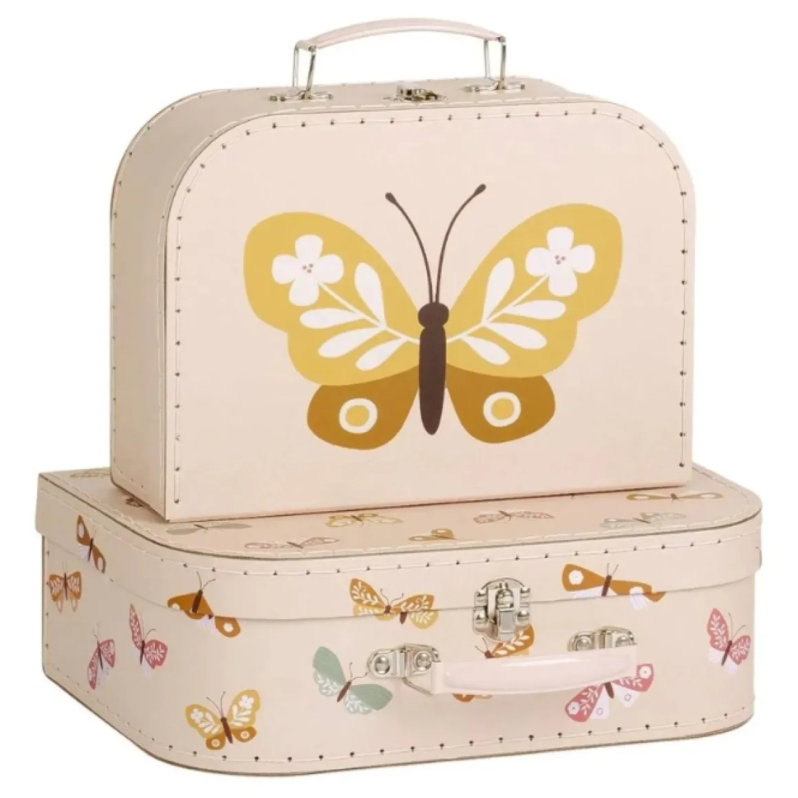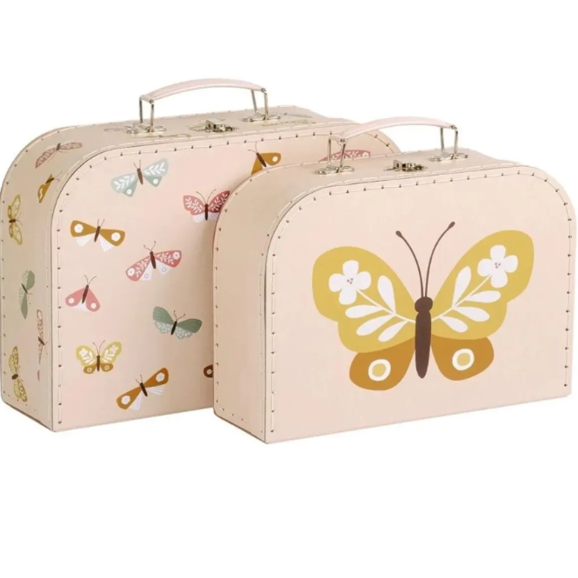 Deze Set Van Twee Koffertjes Met Vlinder Design Staat Schattig Op De Baby- Of Kinderkamer, Is Leuk Om Mee Te Spelen En Handig Voor Het Opbergen Van Speelgoed. De Koffertjes Komen In Twee Verschillende Formaten En Zijn Gemaakt Van Stevig Karton Met Polyester Stiksels. Zowel Het Grote Als Kleine Koffertje Hebben Een Metalen Handgreep En Gesp Waardoor Kleine Schatten Bewaard Zullen Blijven.