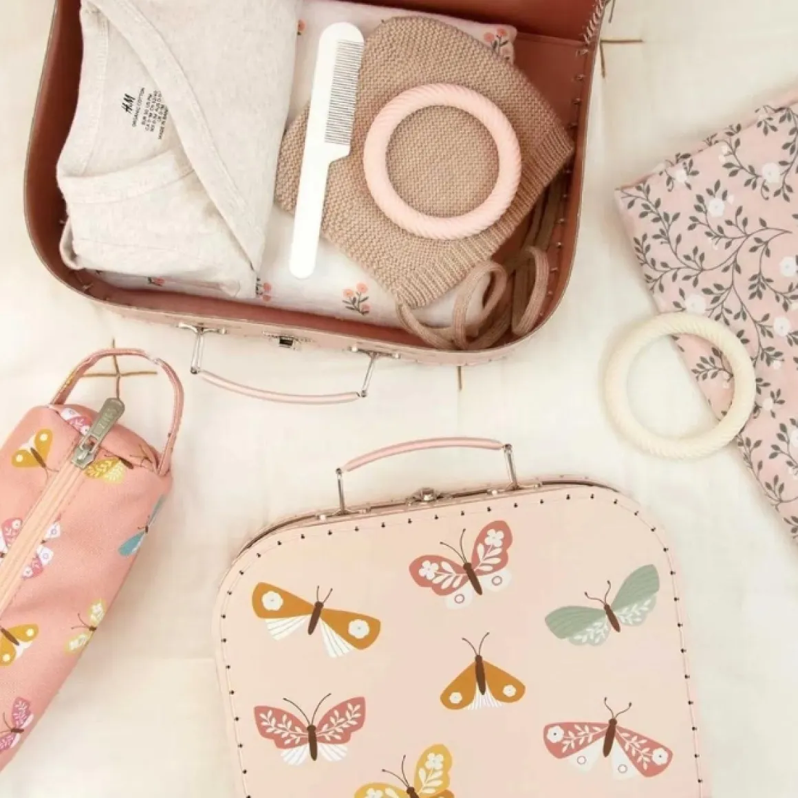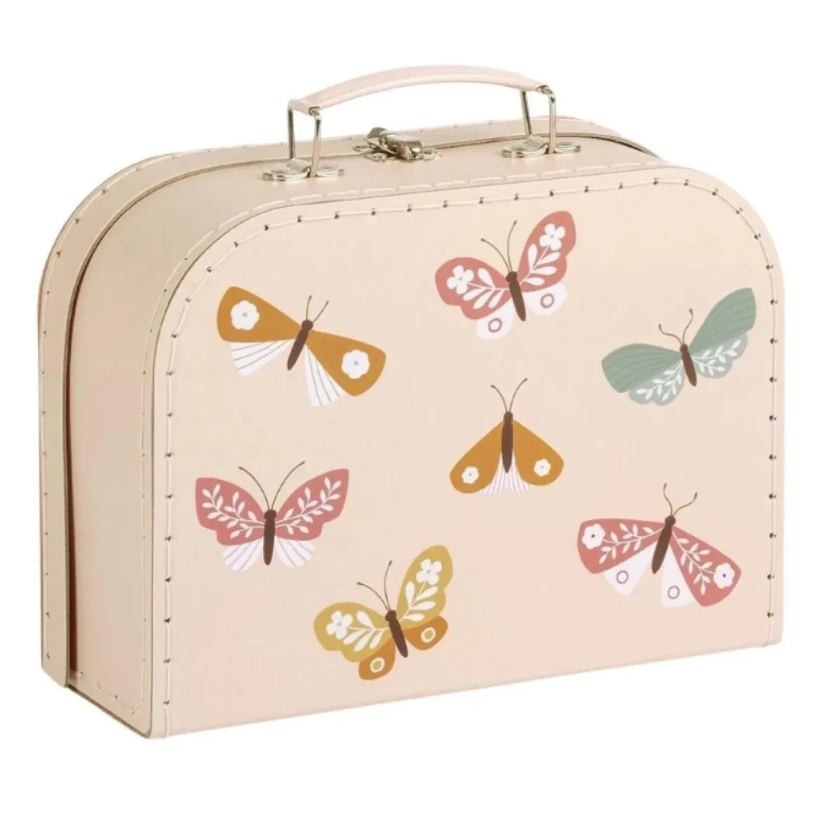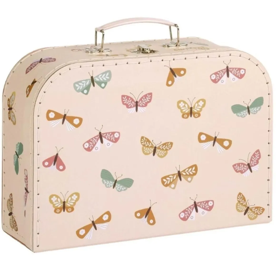 Deze Set Van Twee Koffertjes Met Vlinder Design Staat Schattig Op De Baby- Of Kinderkamer, Is Leuk Om Mee Te Spelen En Handig Voor Het Opbergen Van Speelgoed. De Koffertjes Komen In Twee Verschillende Formaten En Zijn Gemaakt Van Stevig Karton Met Polyester Stiksels. Zowel Het Grote Als Kleine Koffertje Hebben Een Metalen Handgreep En Gesp Waardoor Kleine Schatten Bewaard Zullen Blijven.