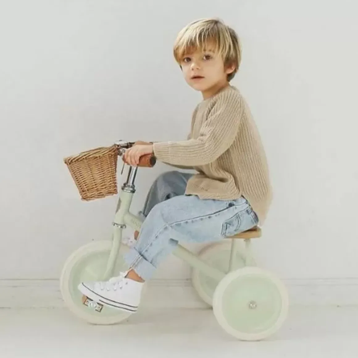 Hoe Tof Is Deze Mintgroene Vintage Trike Van Het Spaanse Merk Banwood?! Je Kunt De Duwstang Gebruiken Om Je Kindje Voort Te Duwen. Als Je Kindje Zelfstandig Kan Fietsen, Haal Je De Duwstang Eraf.