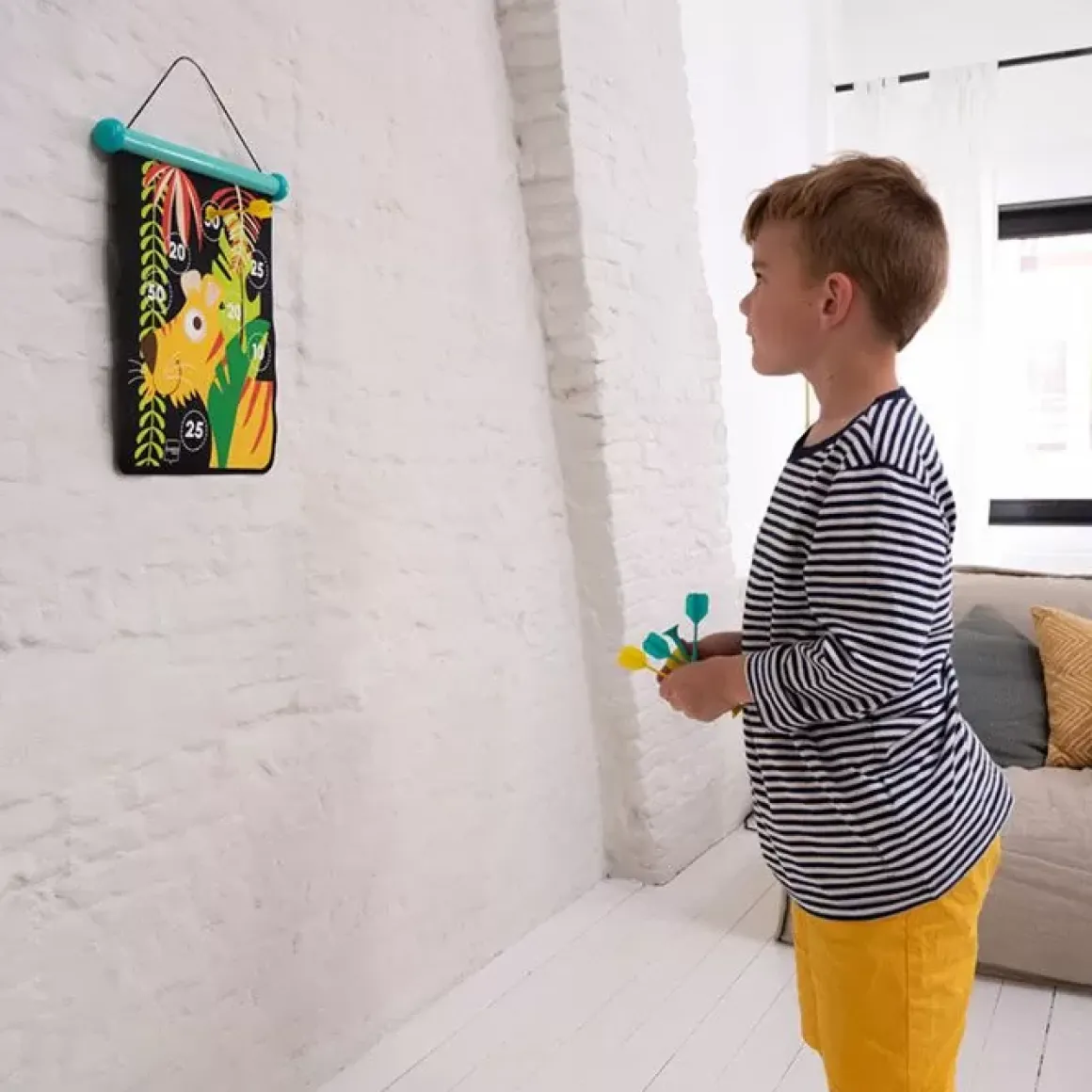 Een Kinder Dartbord In Jungle Stijl, Met Kindvriendelijke Pijlen Die Als Magneten Aan Het Doek Blijven Hangen, Hoe Leuk Is Dat!?