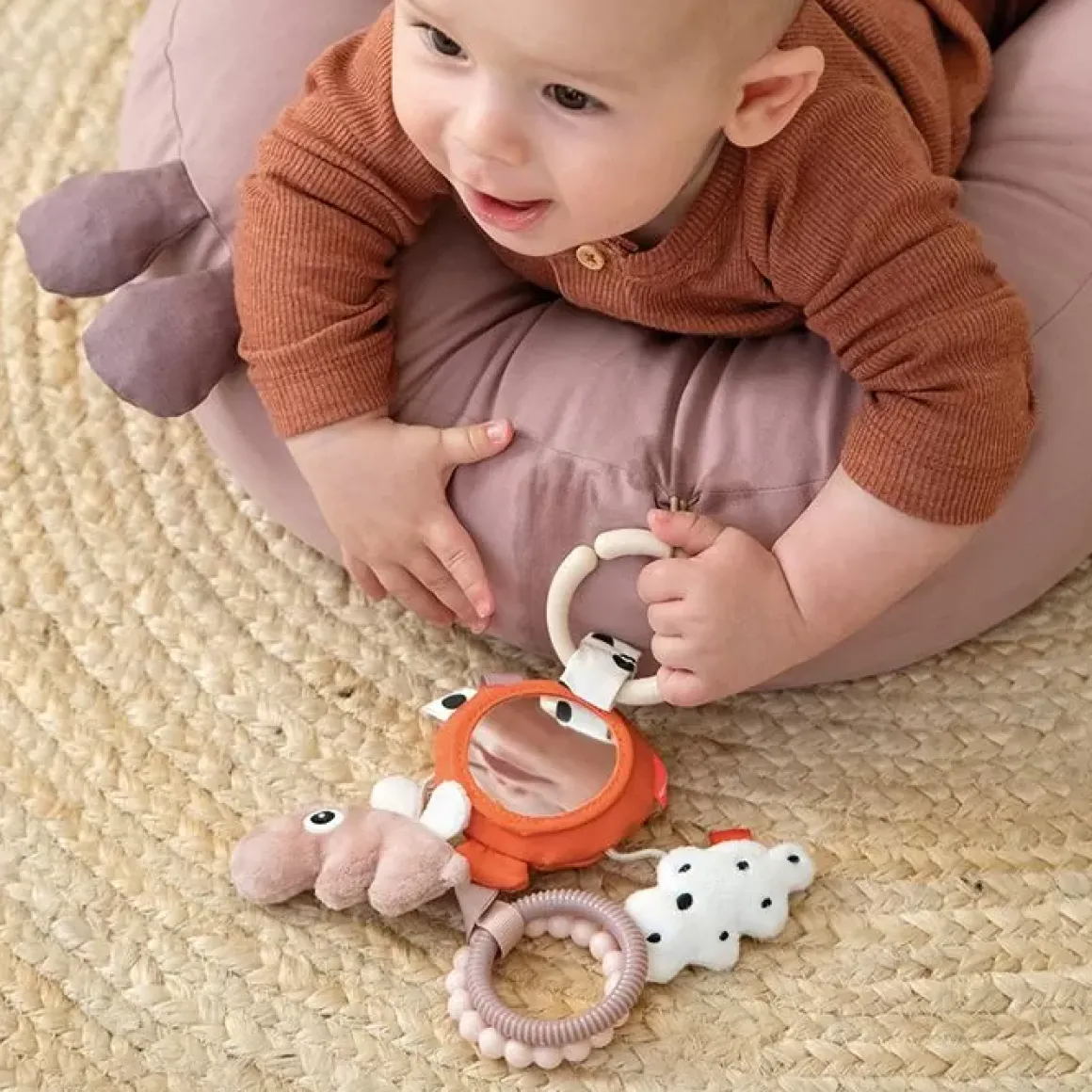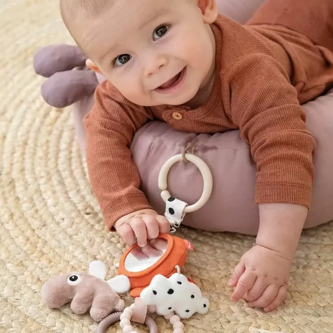 De Activiteitenspiegel Heeft Een Rammelaar, Een Ozzo, Een Wolk Met Zachte Textuur, Twee Ringen Met Textuur En Leuke Labels. Het Kind Kan De Ringen Gemakkelijk Vastpakken En De Activiteitenspiegel Vasthouden. Gebruik De Speelgoedring Om Hem Vast Te Maken Aan De Kinderwagen Of Autostoel.