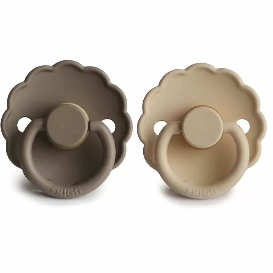 Deze Trendy Fopspenen Set Van Frigg Hebben Een Schattig Daisy Design En Hebben Mooie Croissant En Portobello Kleuren Passend Bij Iedere Outfit.