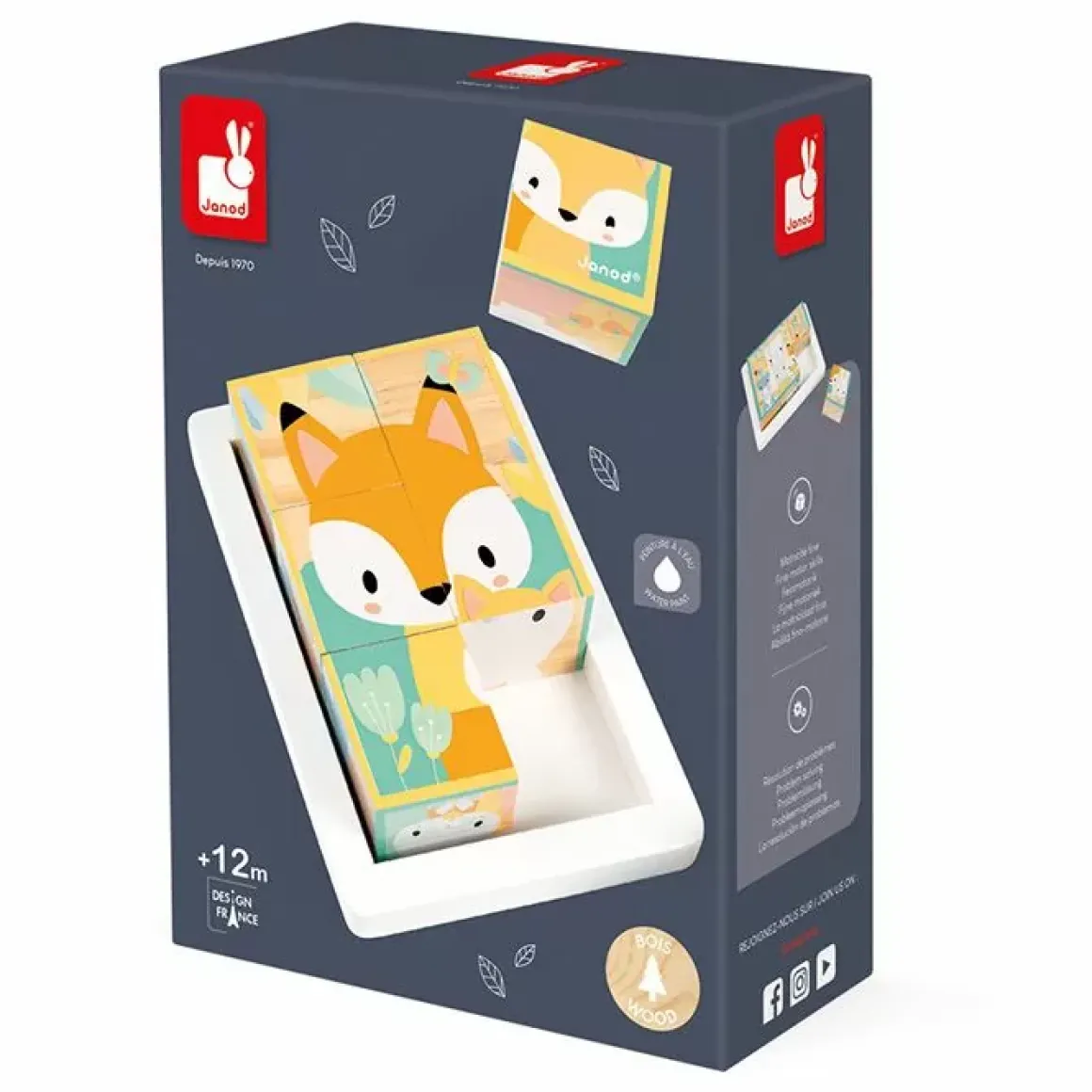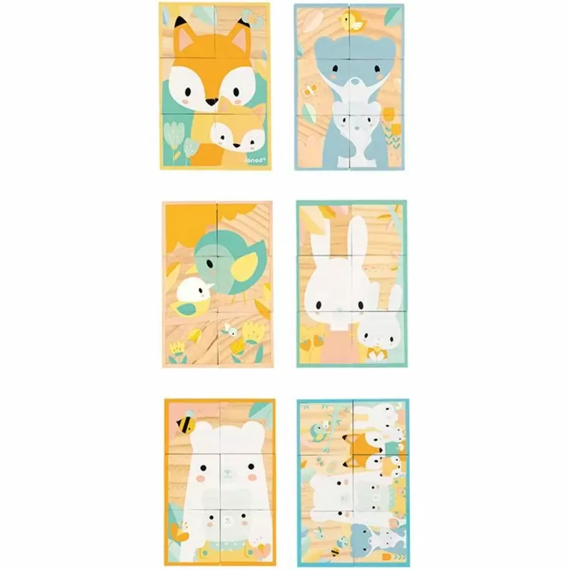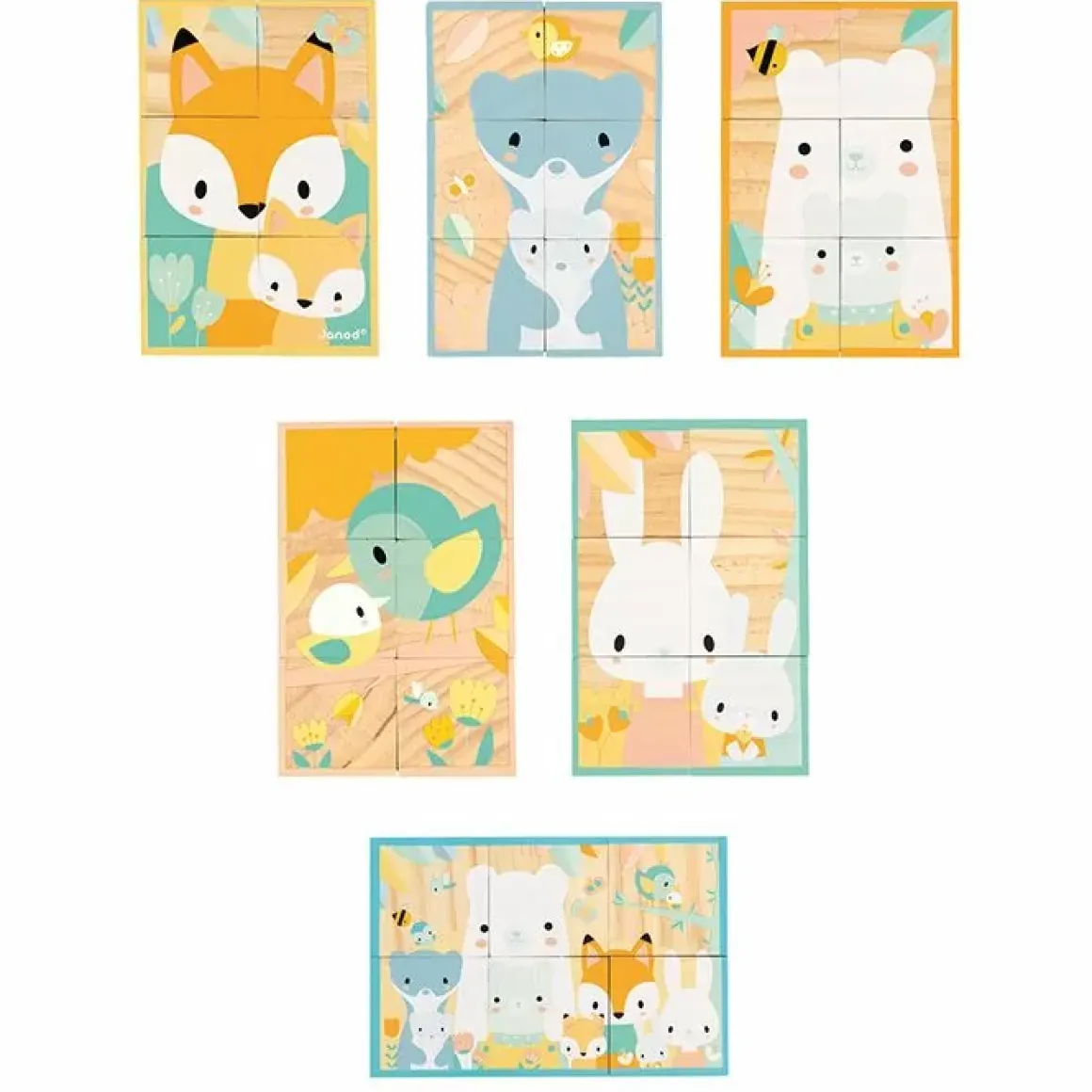 Deze Kleurrijke Houten Blokkenpuzzel Pure Van Janod Bestaat Uit Zes Blokken Van Massief Hout. Op Iedere Kant Van Het Blokje Vind Je Een Nieuwe Puzzel Met Dieren, Waaronder Een Beer, Vos, Konijn, Wezel En Een Hert Met Hun Baby!