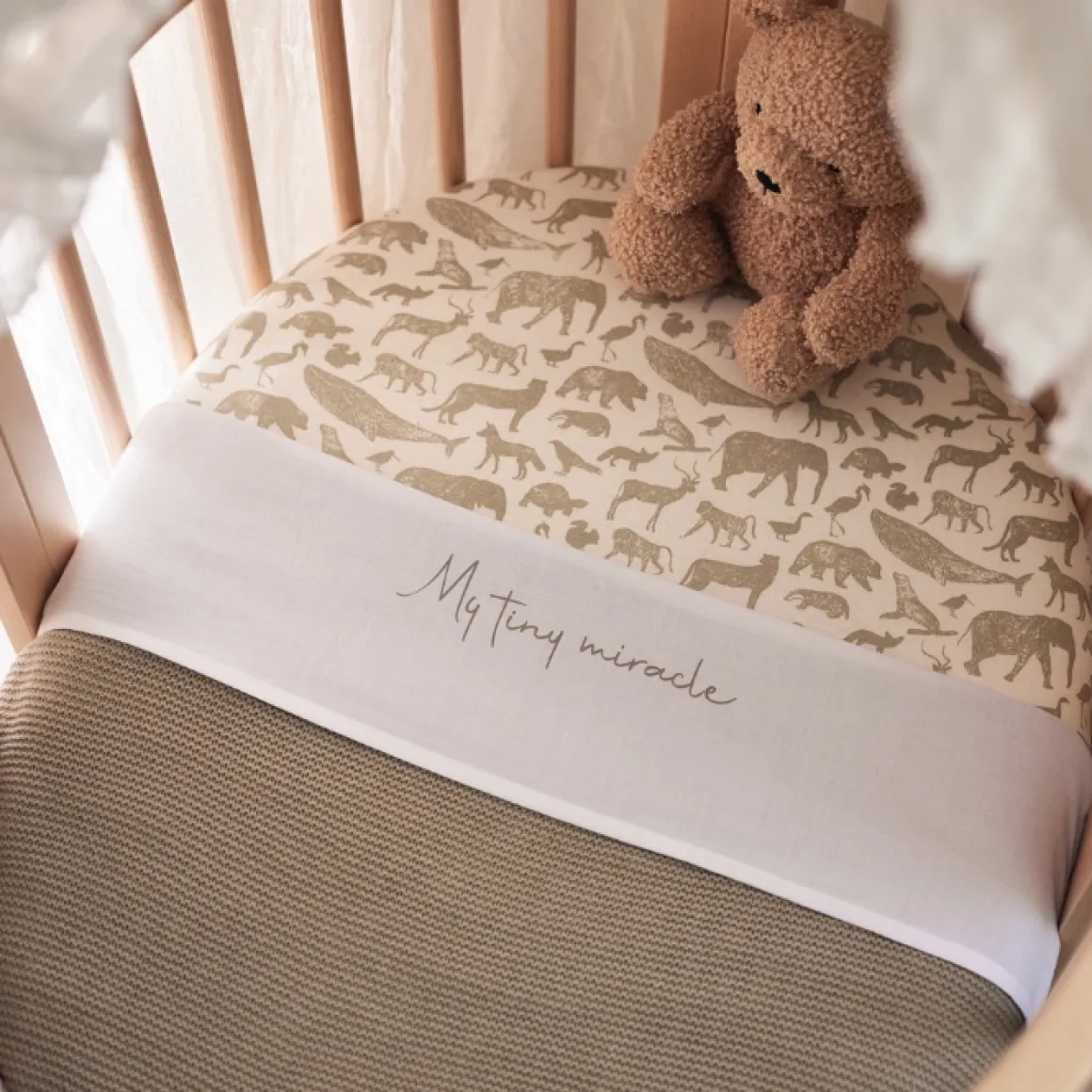 Bescherm Het Matrasje In Het Wiegje Gemakkelijk Met Dit Leuke Hoeslakentje Animals Olive Green. De Avontuurlijke Print Van Animals Neemt Jouw Mini Mee Op Avontuur In Zijn Dromen. Het Hoeslaken Sluit Gemakkelijk Om Het Matras Door De Elastieken Banden In Elke Hoek. Het Hoeslaken Kun Je Perfect Combineren Met De Dekentjes Van Het Grain Knit Thema. Verkrijgbaar Voor In Diverse Formaten Voor Wieg En Ledikant En In Olive Green En Nougat. Tip: Een Hoeslaken Van Wiegformaat Past Ook Perfect Om Een Aankleedkussen Of In De Reiswieg.