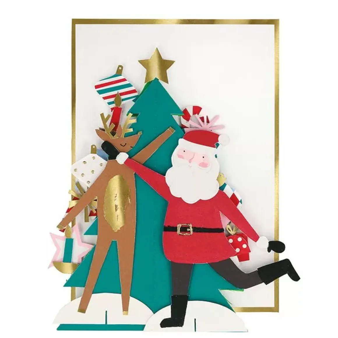 De Kerstkaart Bestaat Uit 3D Honeycomb Figuren Namelijk De Kerstman, Een Gedecoreerde Honingraatboom En Een Rendier. In De Kaart Staat Geschreven: Vrolijk Kerstfeest En De Beste Wensen Voor Een Gelukkig Nieuwjaar. De Kaart Is Gemaakt Van Duurzaam Fsc -Papier En Je Ontvangt Een Witte Envelop Met Gouden Randjes.