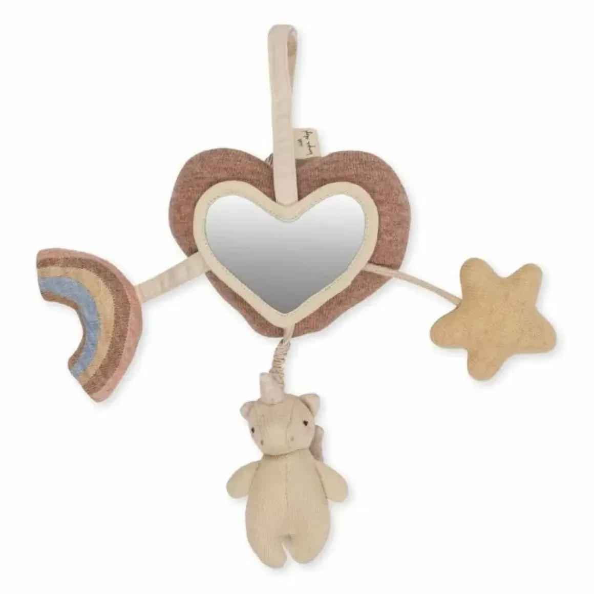 Op Het Hart Zit Een (Plastic) Spiegel En Aan Het Hart Zitten Verschillende Speeltjes Vast. Je Kunt Het Speeltje Ophangen Aan Bijvoorbeeld De Box, De Kinderwagen Of Maxi-Cosi. Het Speeltje Bevat Ook 3 Lieve Knuffelspeeltjes; Een Ster, Een Unicorn En Een Regenboog.