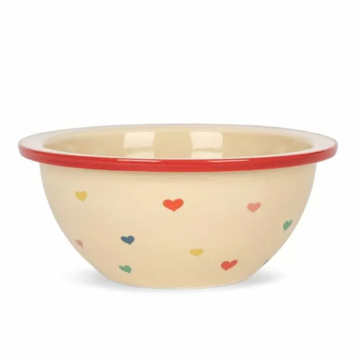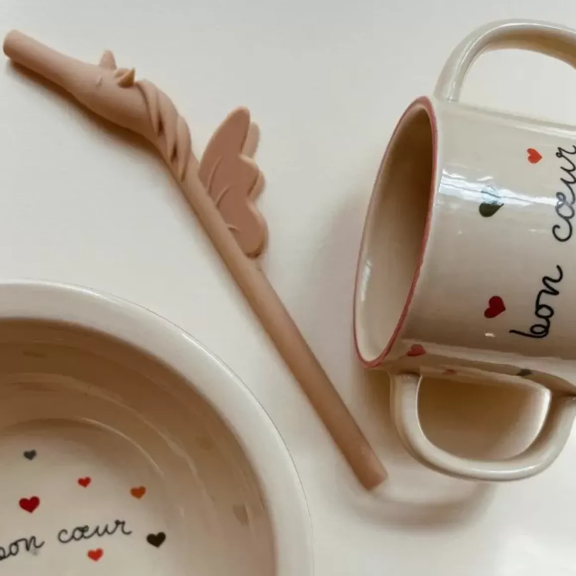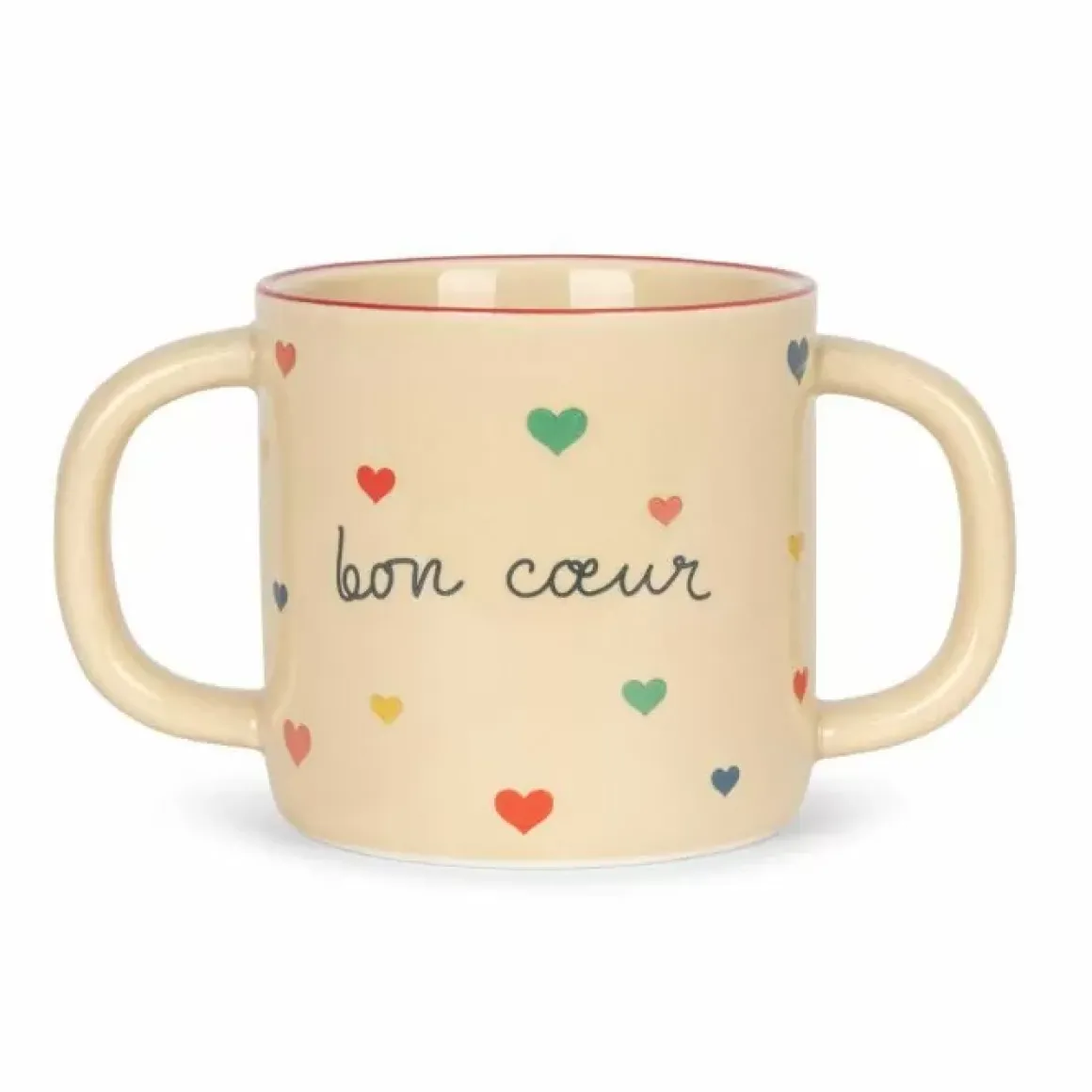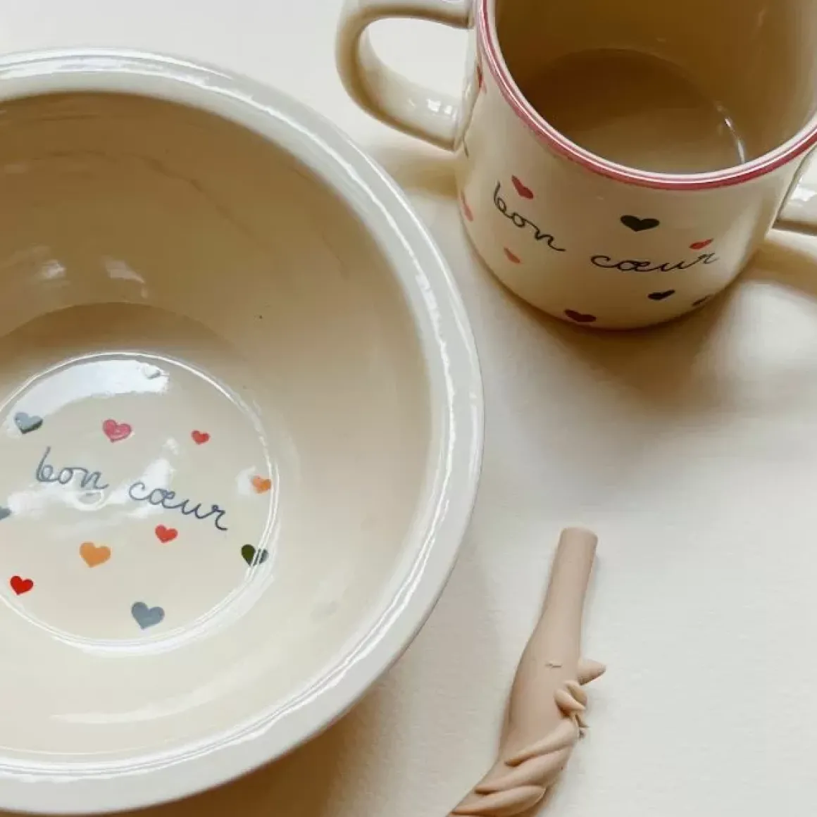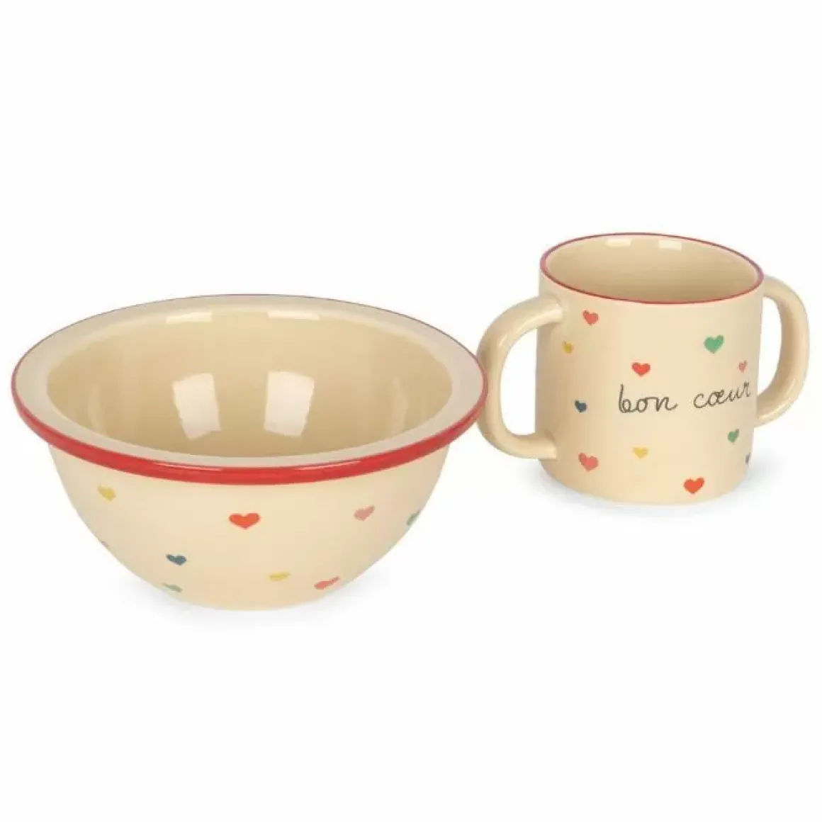 Voeg Een Vleugje Vintage Charme Toe Aan De Eetmomenten Van Je Kleintje Met De Konges Slojd Ceramic Bon Coeur Mok En Schaaltje. Deze Prachtige Set Is Uitgevoerd In Crèmekleur Met Een Rode Rand En Versierd Met Een Kleurrijke Hartjesprint En De Tekst “Bon Coeur”, Wat Zorgt Voor Een Warme En Liefdevolle Uitstraling Bij Elke Maaltijd.