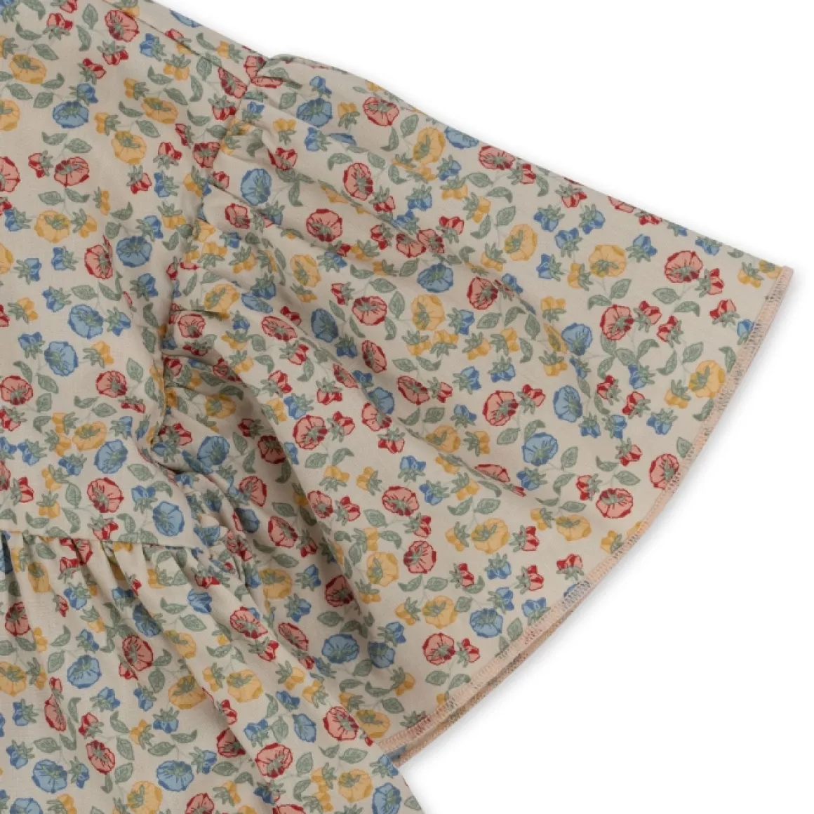 De Zomerse Mathilda Jurk Van Konges Slojd Is Gemaakt Van 100% Biologisch Katoen Met Een Uitlopende Pasvorm, Pofmouwen En Elastische Boorden Met Ruches En Babylockzomen. Je Sluit Het Jurkje Met Een Parelmoer Knoop In De Nek.
