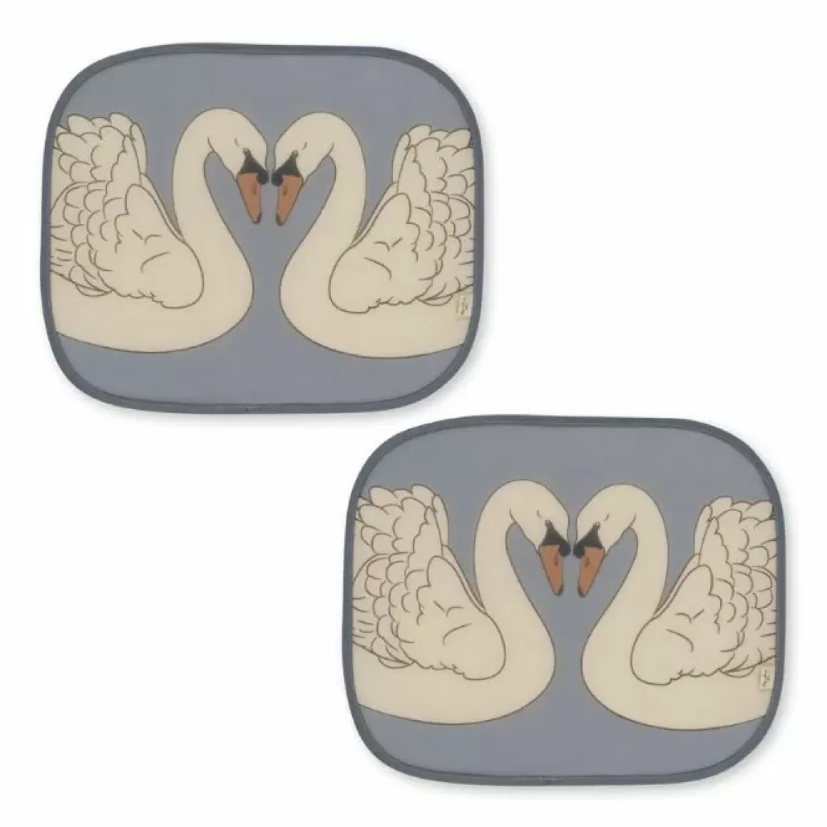 Voeg Een Stijlvolle Touch Toe Aan Je Autoritten Met De Konges Slojd Zonneschermen In Tradewinds. Deze Set Van Twee Blauwe Zonneschermen, Versierd Met Een Elegante Print Van Twee Zwanen, Biedt Niet Alleen Noodzakelijke Zonbescherming Maar Maakt Elke Autorit Ook Visueel Aantrekkelijker Voor Zowel Jou Als Je Kleintjes.