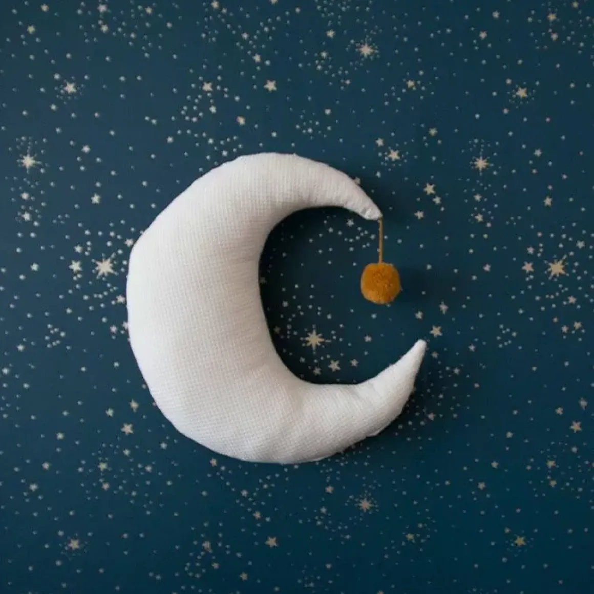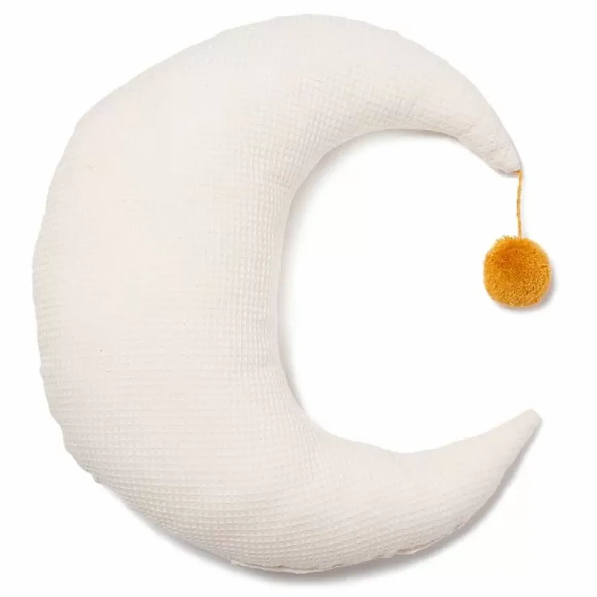 I Love You To The Moon And Back. Plof Op Bed Tegen Dit Zachte Maanvormige Kussentje Pierrot Naturel Van Nobodinoz. Het Kussentje Heeft Een Speelse Pompon En Een Honingraatstofje.