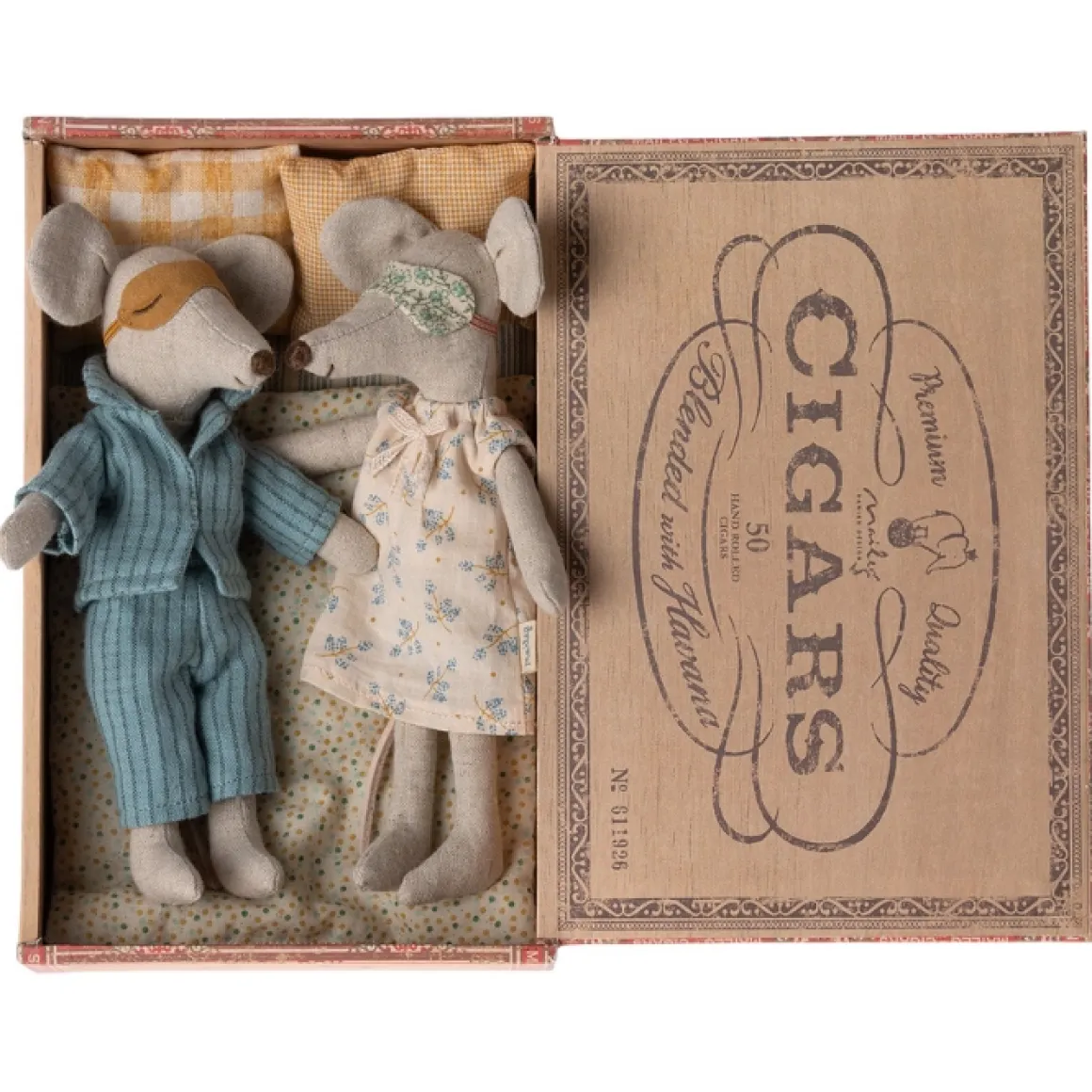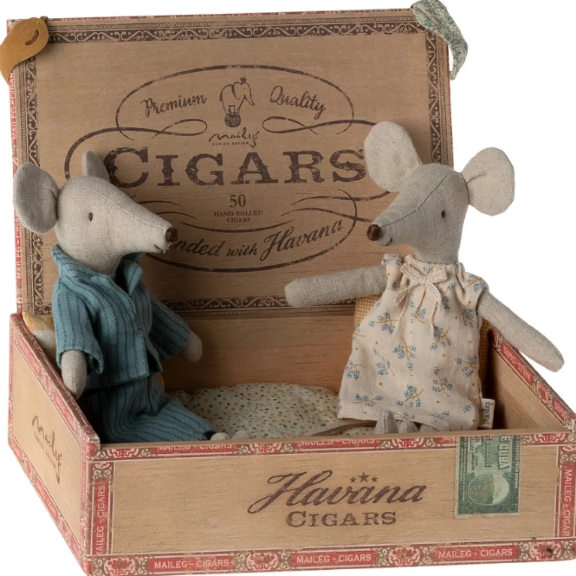 Papa En Mama In Een Sigarendoosje, Zo Schattig! De Papa En Mama Muizen Dragen Nachtkleding En Oogmaskers. Het Sigarenkistje Is Een Perfect Bedje Voor Goede Nachtrust En Zoete Dromen. Beddengoed Kan Variƫren In Kleur.