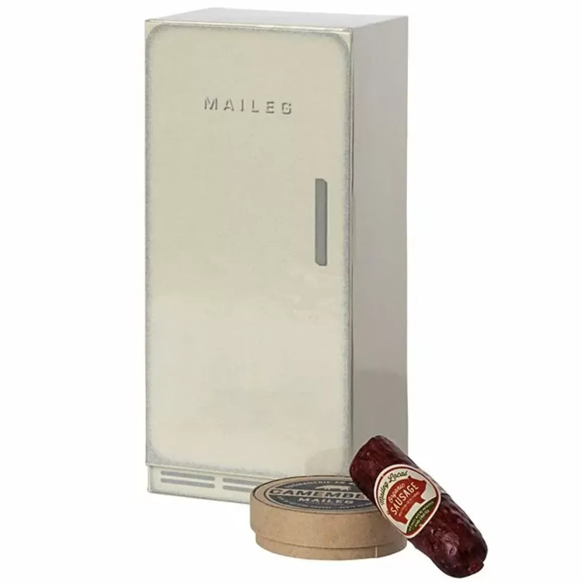Je Muisjes Houden Hun Dagelijkse Boodschappen Lekker Vers In Deze Miniatuur Witte Koelkast Van Maileg. De Koelkast Is Gevuld Met Een Worstje En Een Camembert.