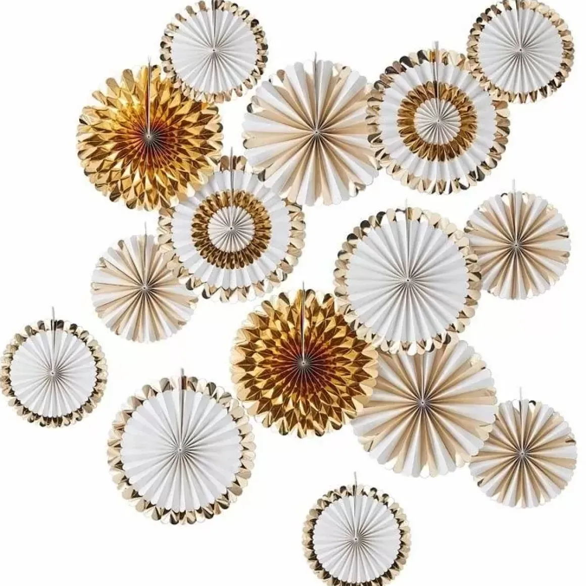 Tover Een Saaie Muur Om Tot Een Spektakel Met De Paperfans Goudfolie-Wit Van Ginger Ray. In De Set Zitten Maar Liefst 15 Paperfans, In Twee Verschillende Maten En Vier Designs.&Nbsp;Door Het Shiny Goudfolie Vallen Ze Op ÉN In De Smaak! Met Paper Fans Kun Je Een Mooie Backdrop CreËRen Voor Een Fotohoek. Combineer Met Bijpassende Photobooth Props Voor De Leukste Foto’S!&Nbsp;