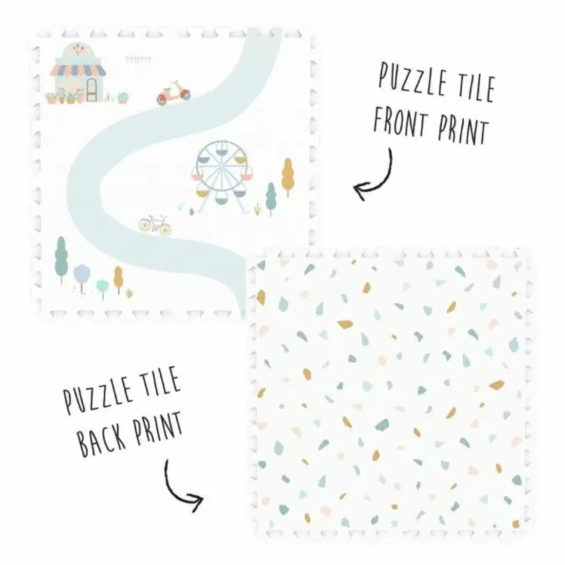 De Play &Amp; Go Speelmat Eva Village Is Een Klassieke Speelmat Van Eva-Schuim In Een Nieuw Jasje. Dubbelzijdig Bedrukt, Dubbel Plezier! Deze Heeft Een Print Van Een Stad Aan De Ene Kant Om Met Auto’S Te Spelen En Aan De Andere Kant Een Terrazzo Print In Pastelkleurtjes.