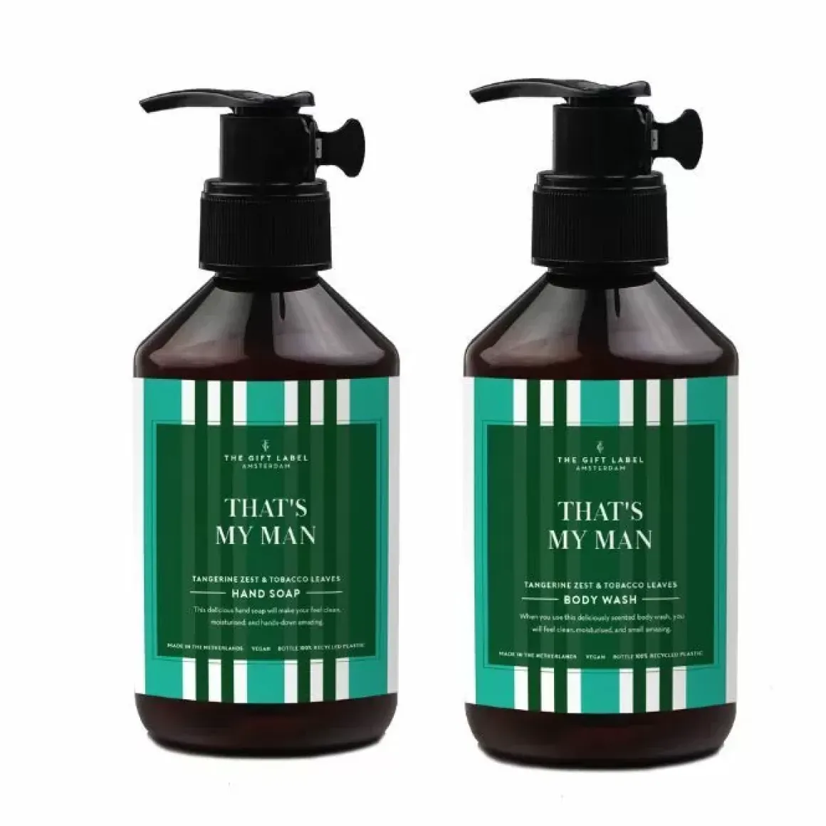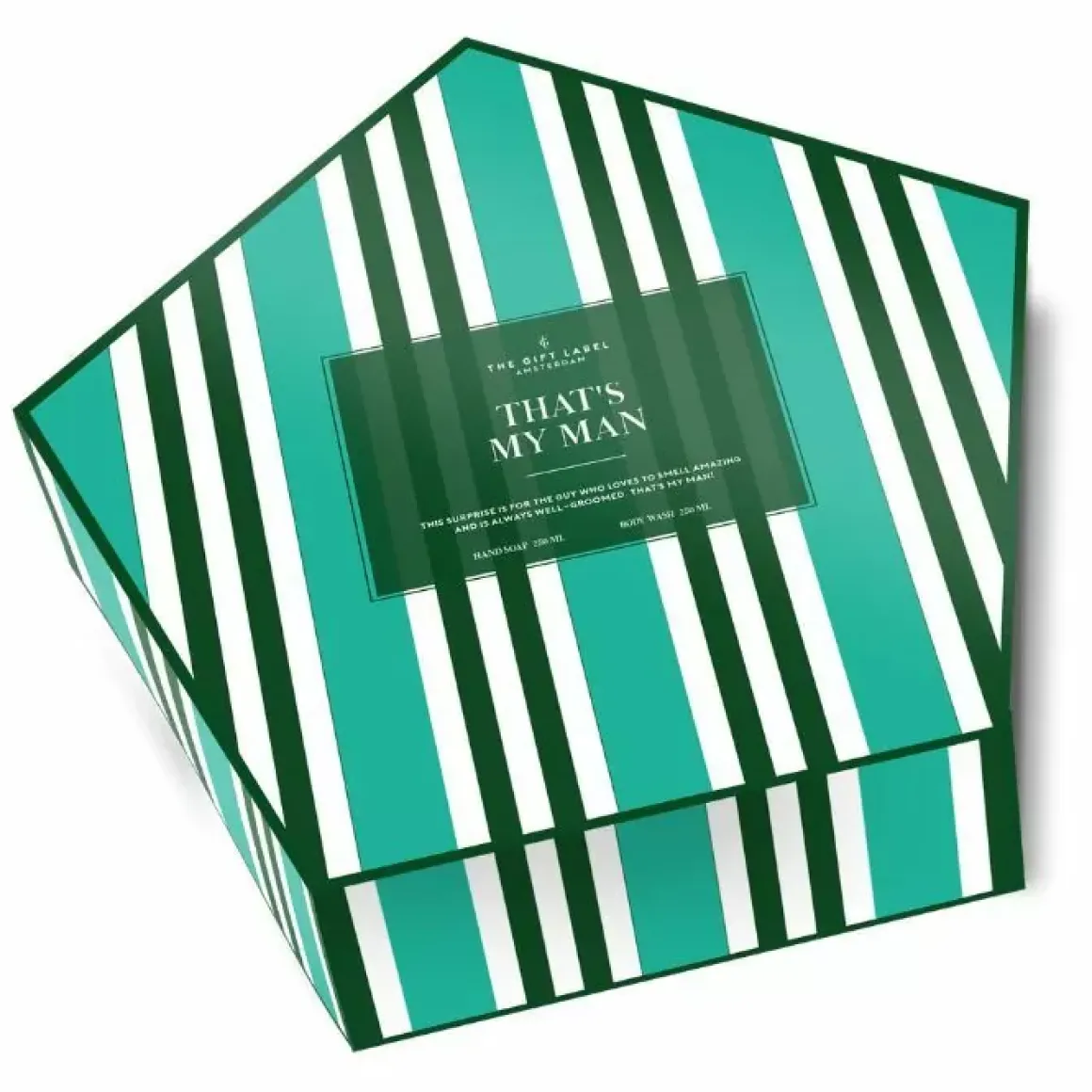 That’S My Man! Deze Giftbox Is Een Perfect Geschenk Voor De Man Waar Jij Zo Trots Op Bent. In Deze Prachtige Groen Gestreepte Giftbox Zit Een Handzeep En Bodywash Van The Gift Label.