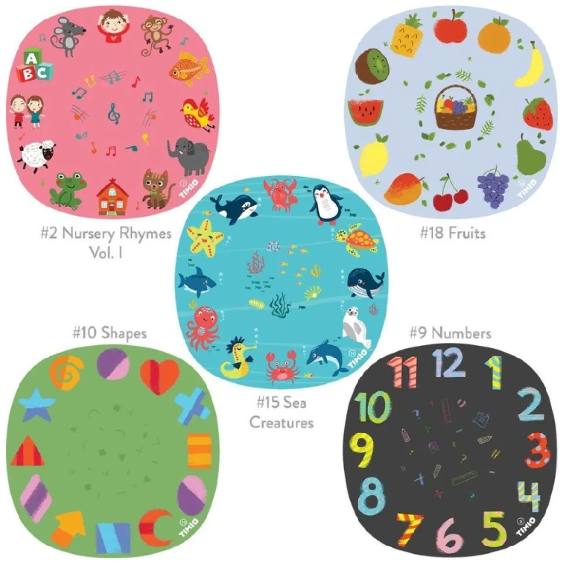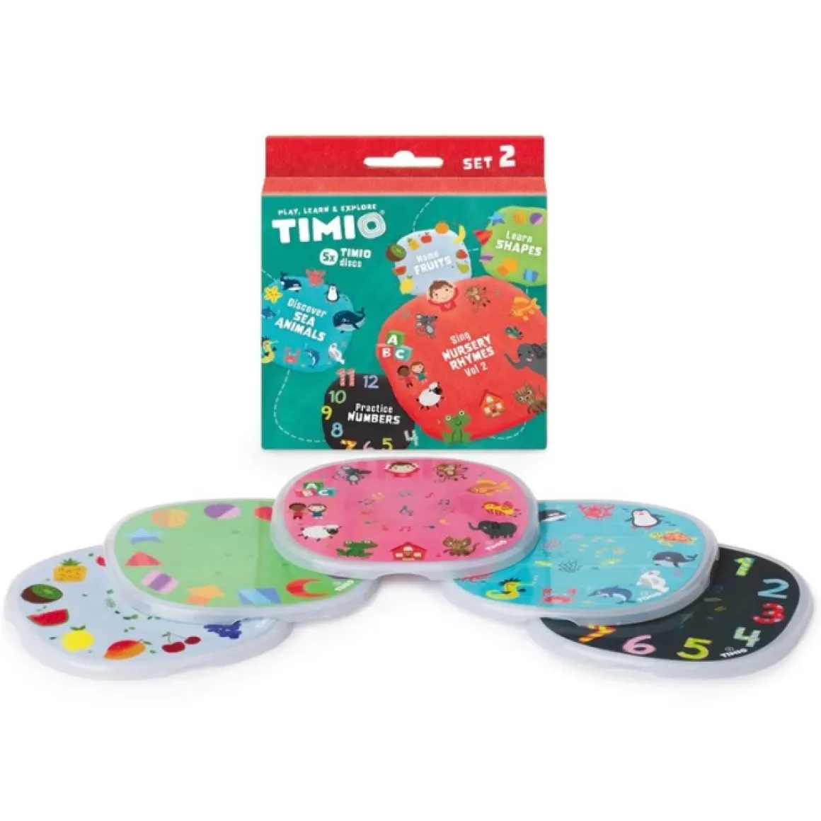 De Timio Uitbreidingsset 2 Bestaat Uit 5 Disks Voor De Timio Player Met Onder Andere Getallen, 96 Kinderliedjes Vol. 2, Zeedieren, Vormen En Fruit.
