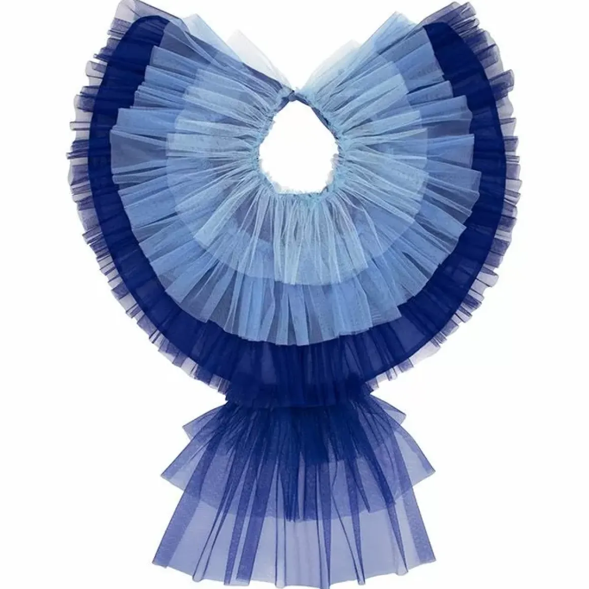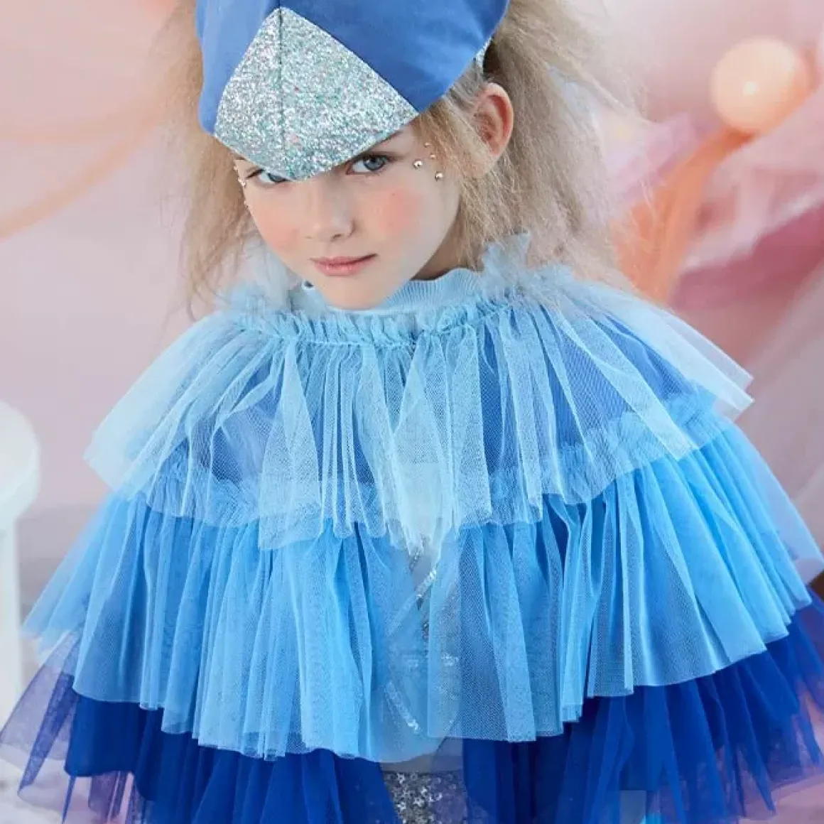 Voel Je Zo Vrij Als Een Vogel Met Deze Prachtige Blauwe Cape Om Je Nek. Het Kostuum Bevat Prachtige Bewerkte Blauwe Vleugels En Een Staart, Beide Gemaakt Van Gegolfde Tule. Het Hoedje Is Gemaakt Van Blauw Fluweel, Met Geborduurde Zilveren Ogen En Een Glinsterende Snavel. De Verkleedset Is Geschikt Voor Kinderen Tussen De 3-6 Jaar.