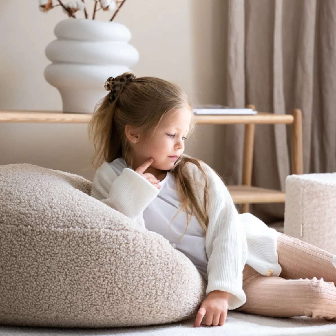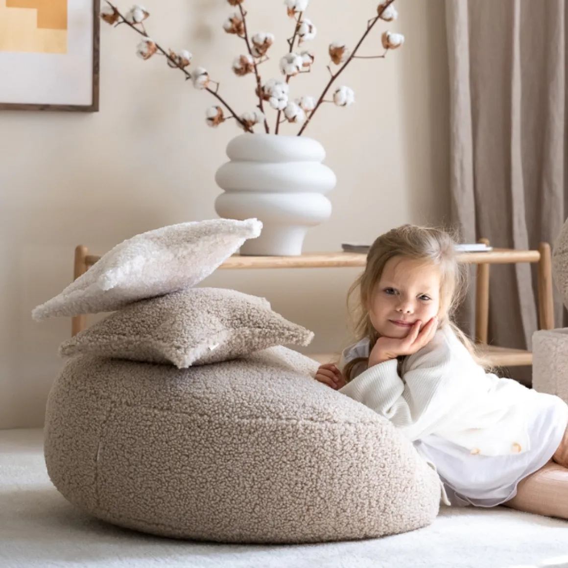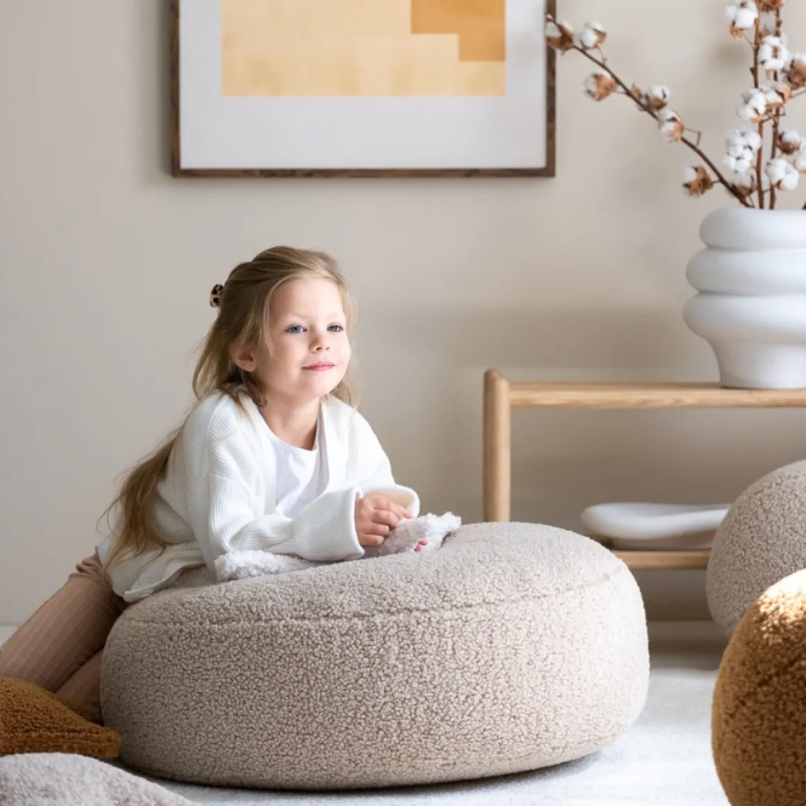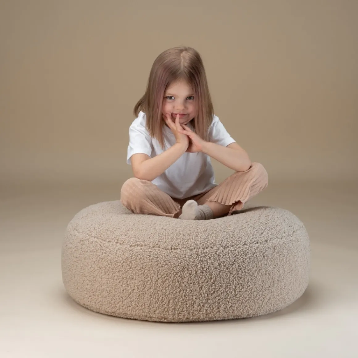 De Poef Is Gemaakt Van Oeko-Tex® Gecertificeerde Teddystof En Heeft Een 100% Standard 100 By Oeko-Tex® Niet-Geweven Vezel Met Een 100% Geëxpandeerd Polystyreen Vulling.