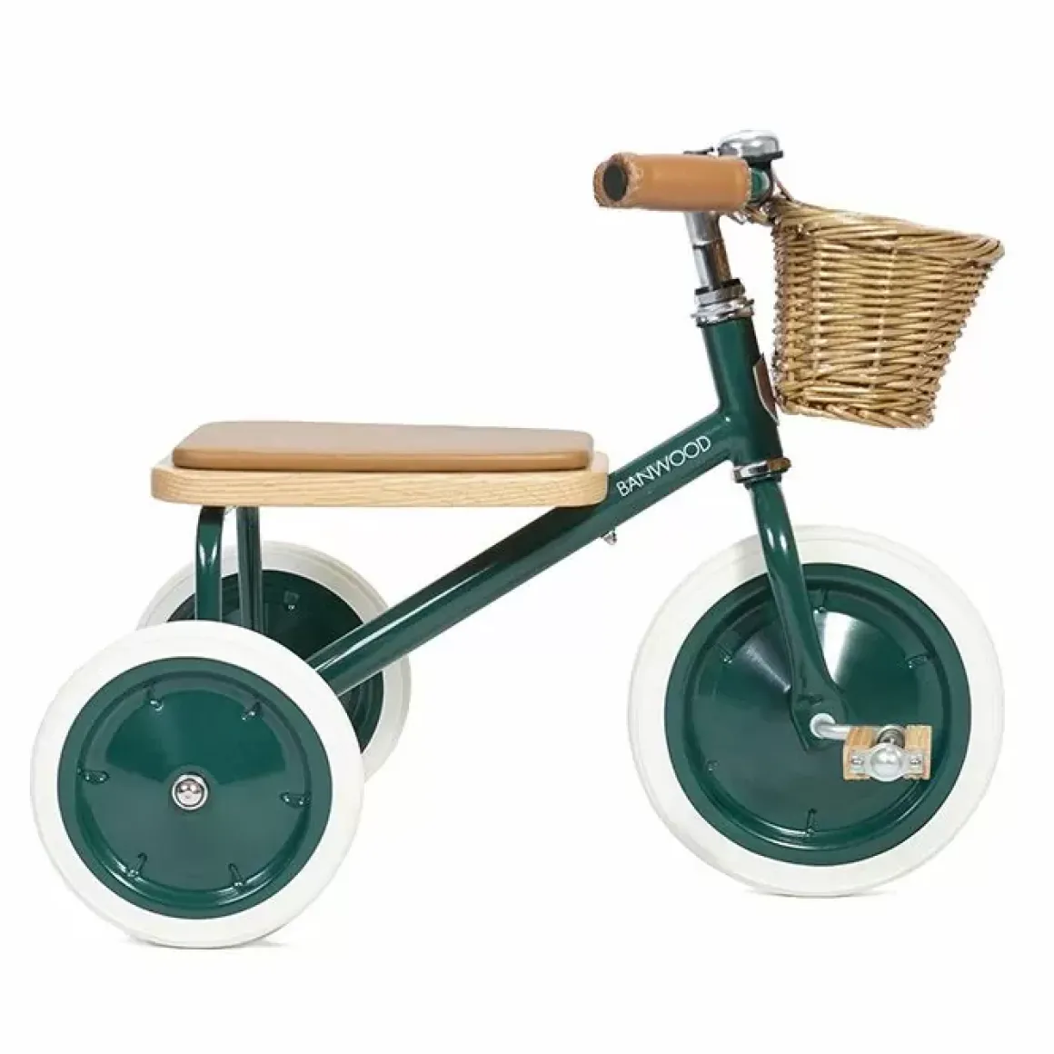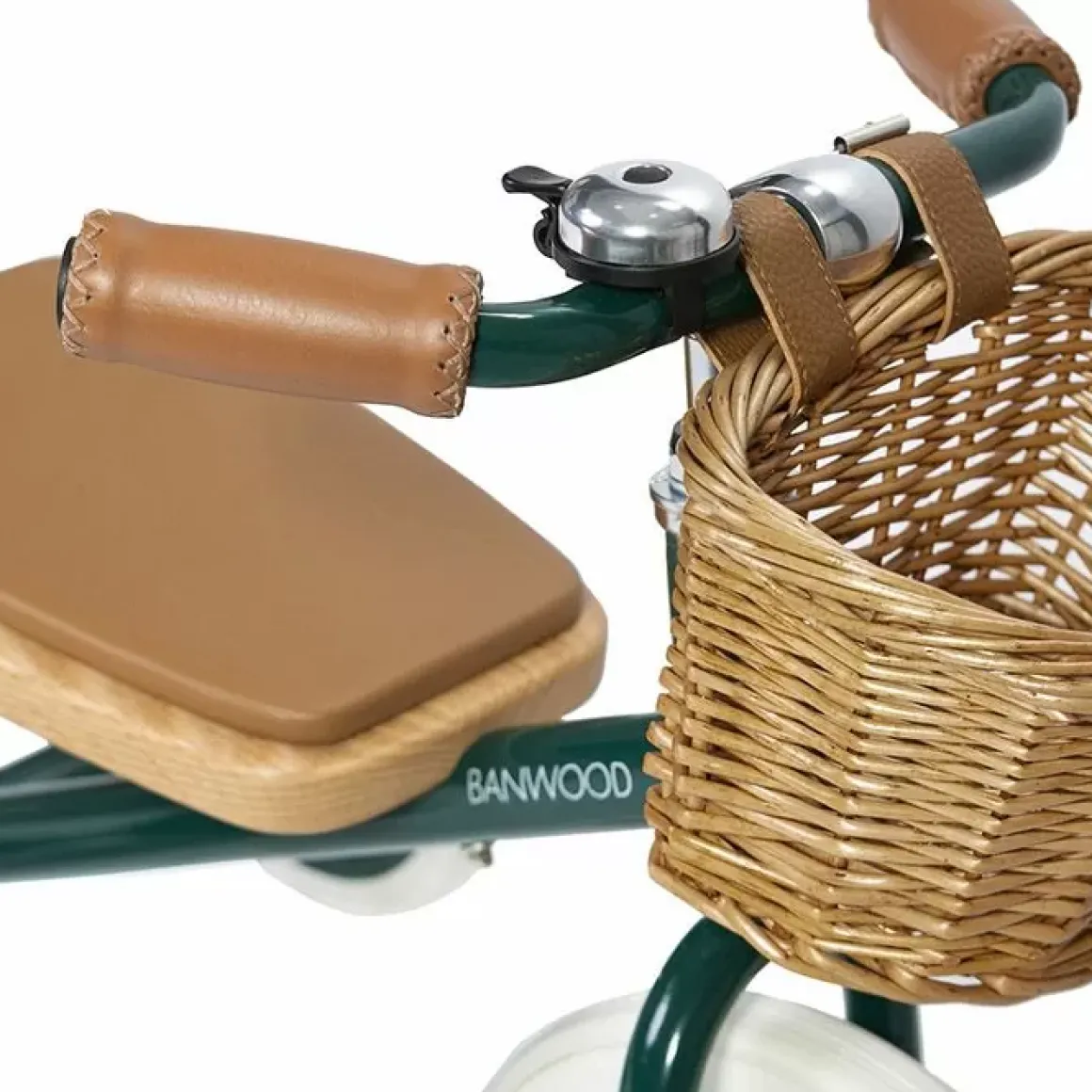 De Banwood Trike Is Een Klassiek Ontworpen Peuter Driewieler Is Een Grote Bron Van Blijdschap En Troost Voor Alle Kinderen. Met Een Zacht Gewatteerd Zitje, De Mooie Groene Kleur, De Veganistische Leren Details, De Glimmende Fietsbel, De Eikenhouten Pedalen, Het Rieten Mandje Aan De Voorkant Om De Favoriete Knuffel In Mee Te Laten Fietsen, Zal Dit Fietsje Een Groot Succes Zijn Bij Ieder Kind.