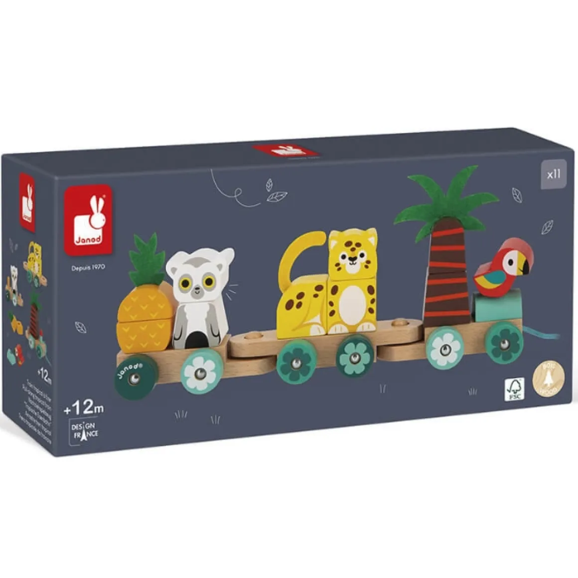 Dit Trekspeelgoed Is Een 2-In-1 Speelgoed Voor Vroegtijdig Leren En Is Ook Een Bouwpakket: De 3 Wagons Zijn Afneembaar En 11 Stukken Kunnen Gestapeld Worden Om Een Palmboom, Een Maki, Een Jaguar, Een Ananas En Een Papegaai Op Zijn Zitstok In Elkaar Te Zetten! Dit Wandelspeelgoed Is Perfect Om De Kleintjes Aan Te Moedigen Zich Te Bewegen En Hen Te Helpen Hun Grove Motoriek Te Ontwikkelen. Een Zachte Mix Van Hout En Vilt! Een Kleurrijke Trein Die Ideaal Is Om Baby’S Op Hun Reis Te Begeleiden, Vanaf 1 Jaar. Gemaakt Van Hout Uit Duurzaam Beheerde Bossen (Fsc®-Gecertificeerd) En Verf Op Waterbasis.