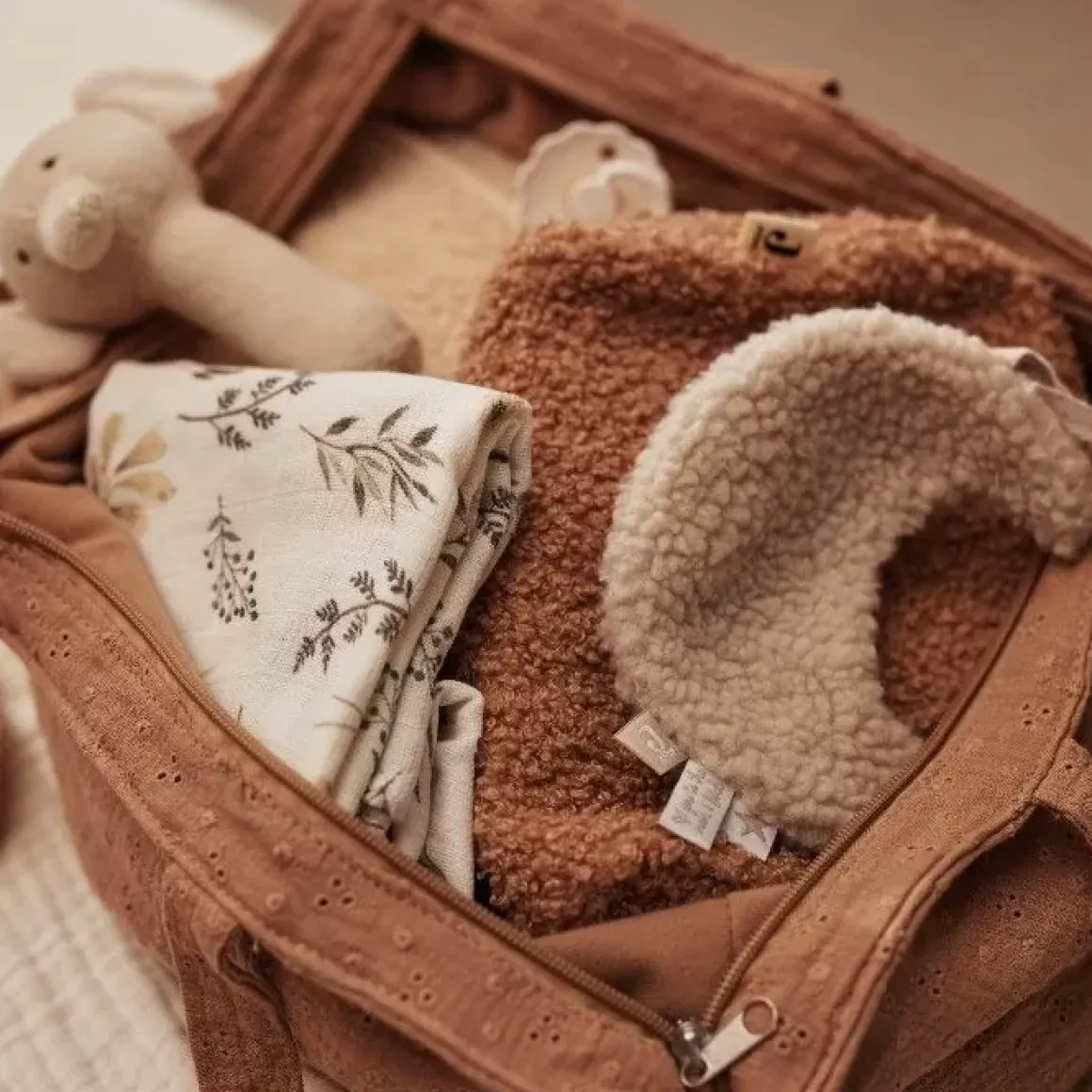 De Tas Is Gemaakt Van Een Zachte Muslin Stof In Een Heerlijk Kleurtje, Biscuit. De Buitenkant Van De Tas Heeft Een Lief Embroidery Werkje Van Bloemetjes In De Stof En De Binnenkant Is Gemaakt Van Polyester.