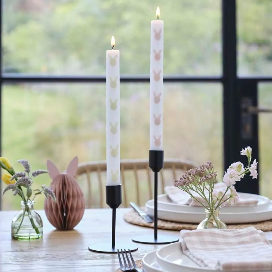 Voeg De Laatste Details Toe Aan Het Evenement Met Onze Paashaaskaarsen. Elke Verpakking Bevat 2 Dinerkaarsen Met Groene En Roze Pastelkleurige Paashaaskoppen.