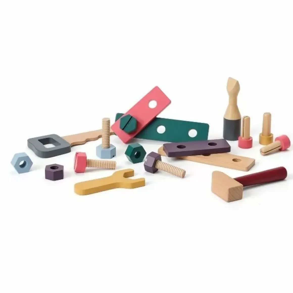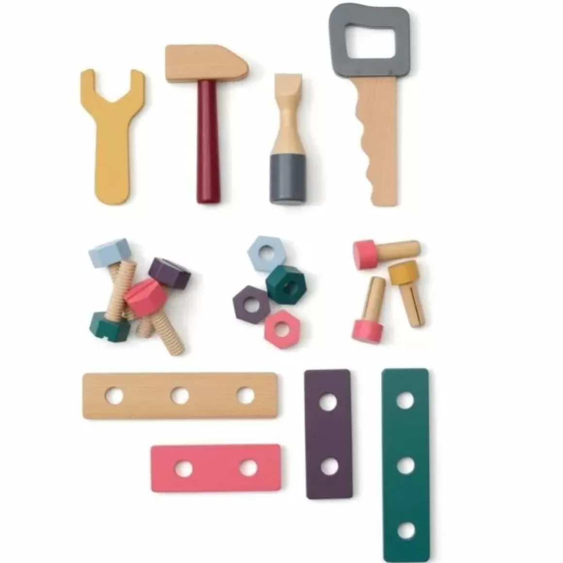 Aan De Korte Kant Van De Doos Zitten Slimme Gaten Met Schroefdraad Waar Je Je Schroeven In Kunt Schroeven En Vast Kunt Zetten Met Moeren Als Een Echte Timmerman. Aan De Lange Kant Zitten Gaatjes Die Uitstekend Geschikt Zijn Voor Je Nagels. Of Waarom Geen Spannende Vorm Bouwen Met De Bouwplaten? Maar Wat Zou De Kleine Timmerman Zijn Zonder Speelgoedgereedschap? Je Vindt Er Natuurlijk Een Hamer, Moersleutel, Zaag En Schroevendraaier In! Alles Is Gemaakt Van Fsc-Gecertificeerd Hout Dat Generaties Lang Kan Worden Gebruikt.