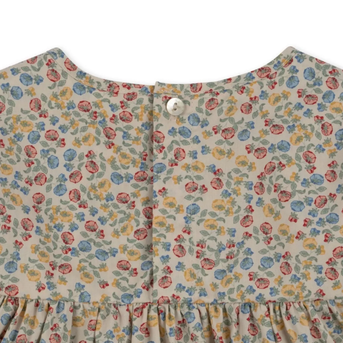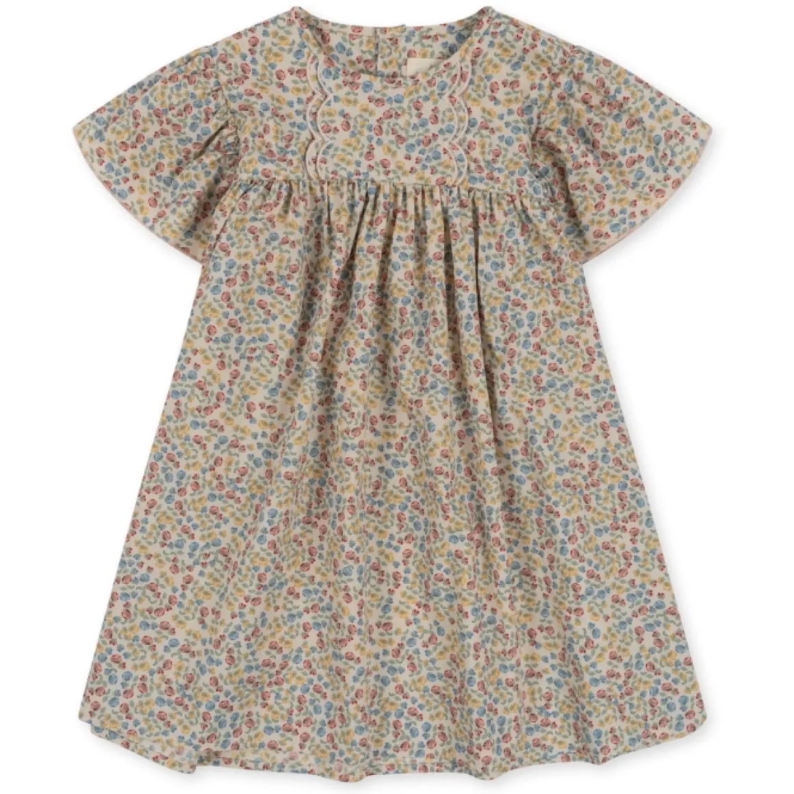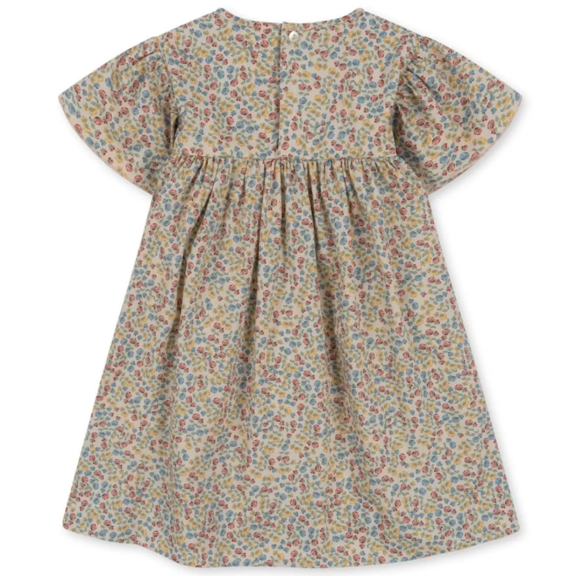 De Zomerse Mathilda Jurk Van Konges Slojd Is Gemaakt Van 100% Biologisch Katoen Met Een Uitlopende Pasvorm, Pofmouwen En Elastische Boorden Met Ruches En Babylockzomen. Je Sluit Het Jurkje Met Een Parelmoer Knoop In De Nek.