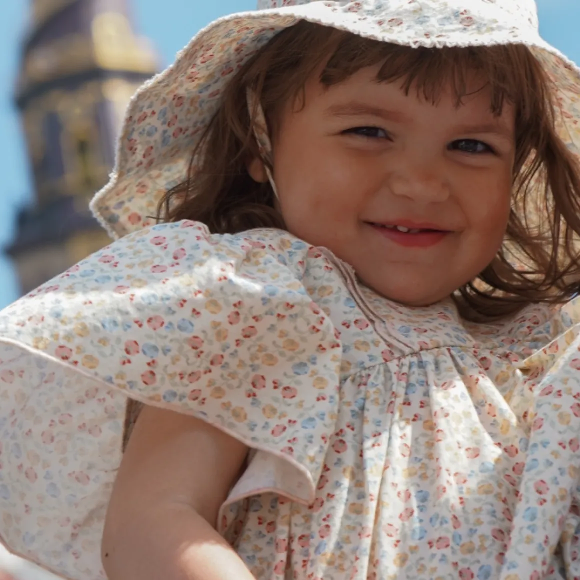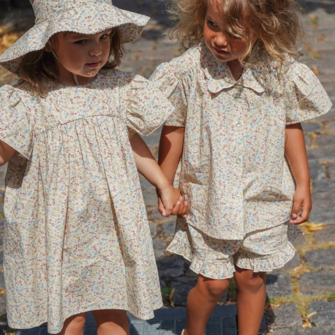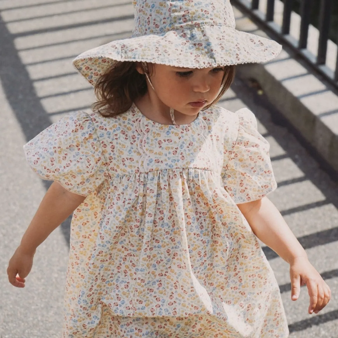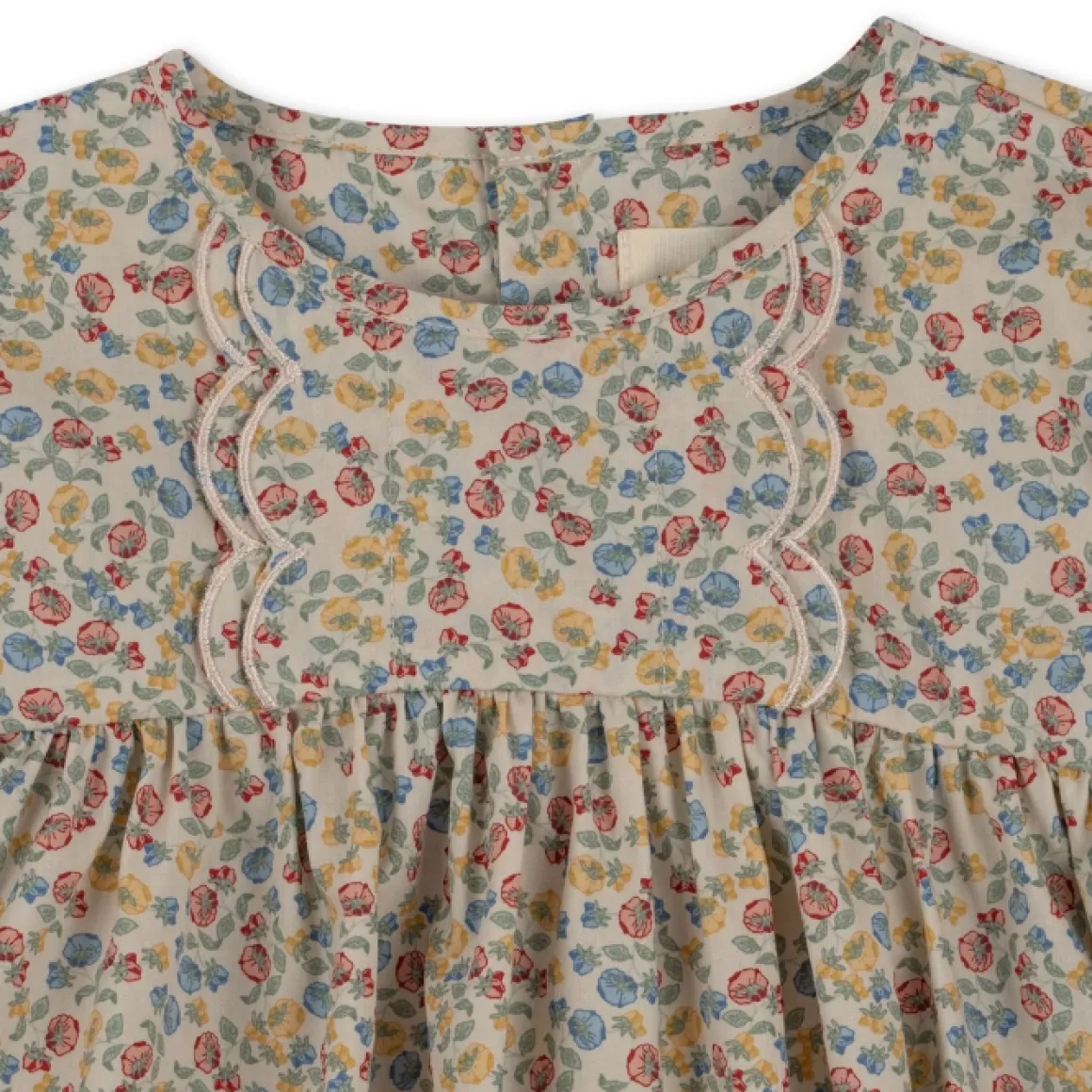 De Zomerse Mathilda Jurk Van Konges Slojd Is Gemaakt Van 100% Biologisch Katoen Met Een Uitlopende Pasvorm, Pofmouwen En Elastische Boorden Met Ruches En Babylockzomen. Je Sluit Het Jurkje Met Een Parelmoer Knoop In De Nek.