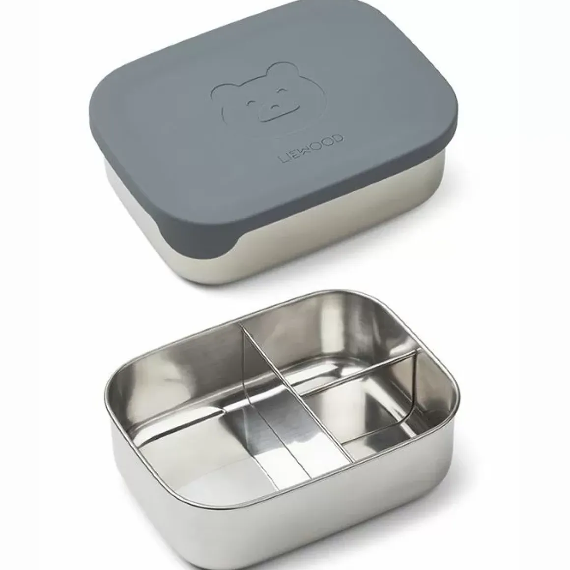 De Lunchbox Is Verdeeld In Drie Handige Vakken En Wordt Geleverd Met Een Deksel In Een Mooie Blauwe Kleur, Met Hierop Een Lief Beren Gezichtje.