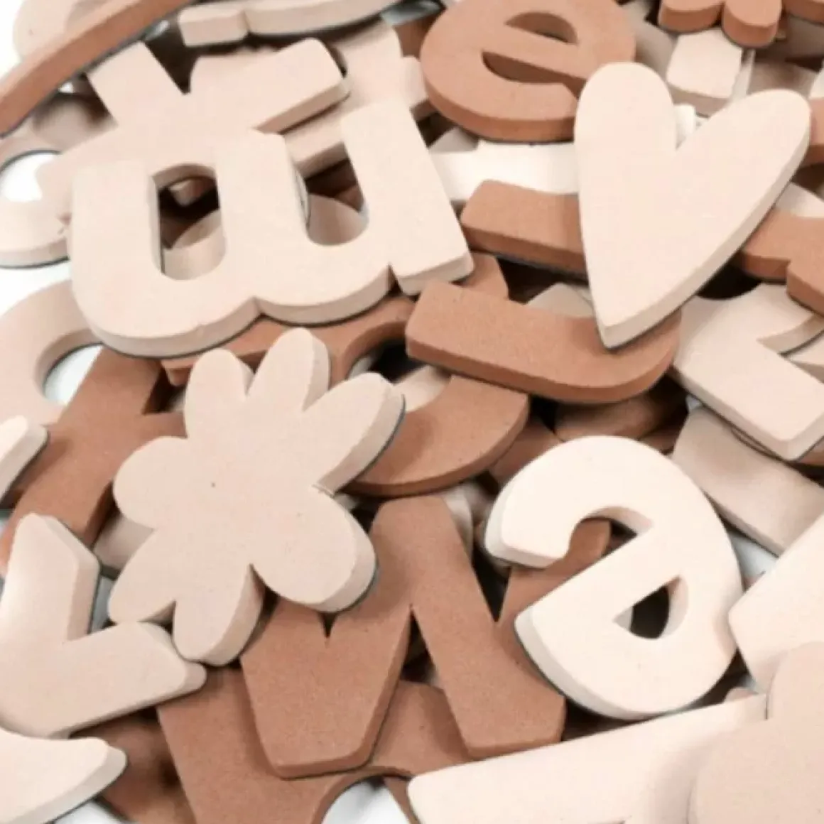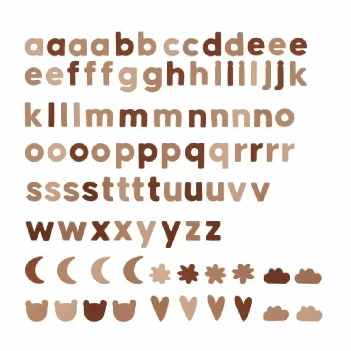 De Set Bestaat Uit 75 Kleine Letters En 20 Figuurtjes In De Kleuren Nude, Perzik En Caramel.