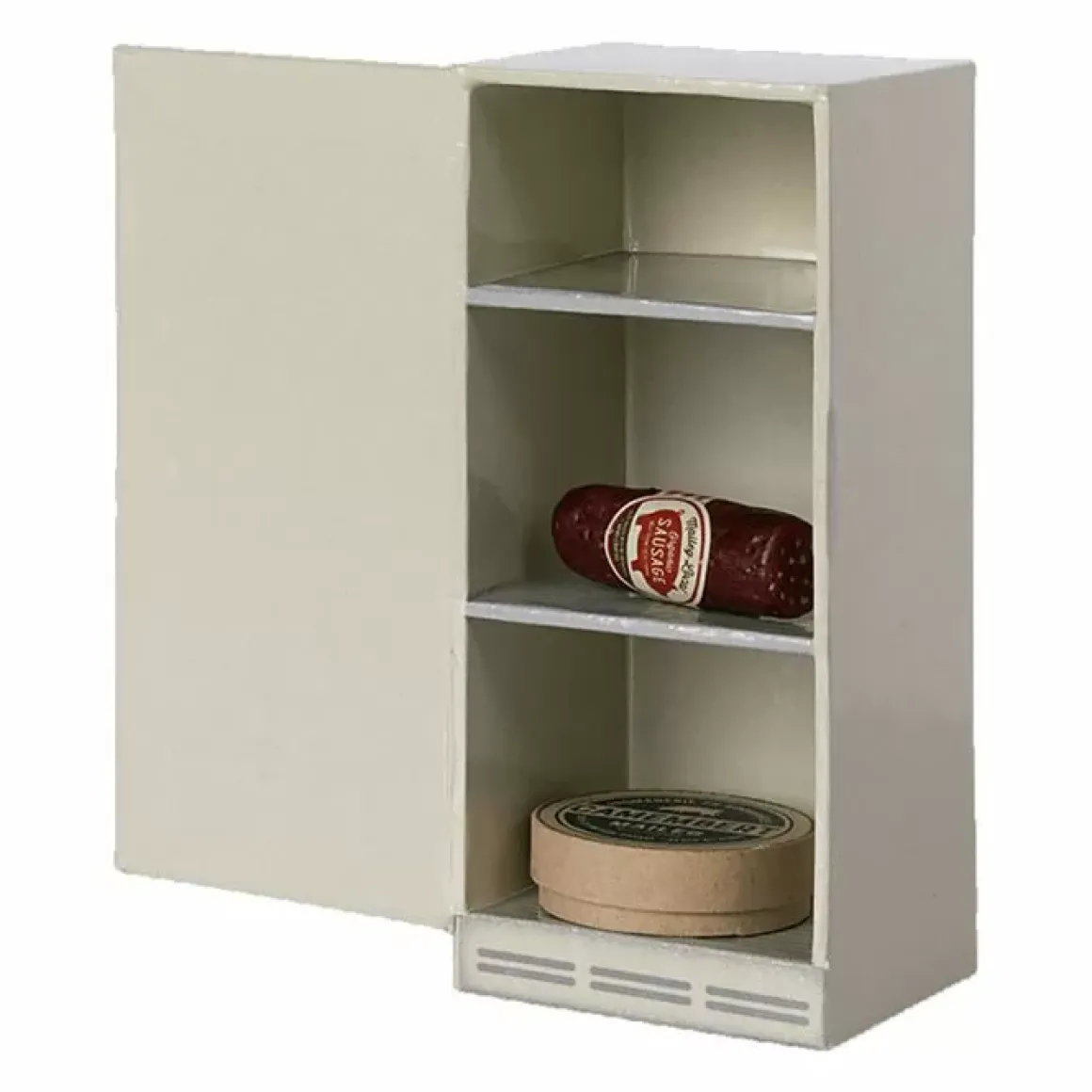 Je Muisjes Houden Hun Dagelijkse Boodschappen Lekker Vers In Deze Miniatuur Witte Koelkast Van Maileg. De Koelkast Is Gevuld Met Een Worstje En Een Camembert.