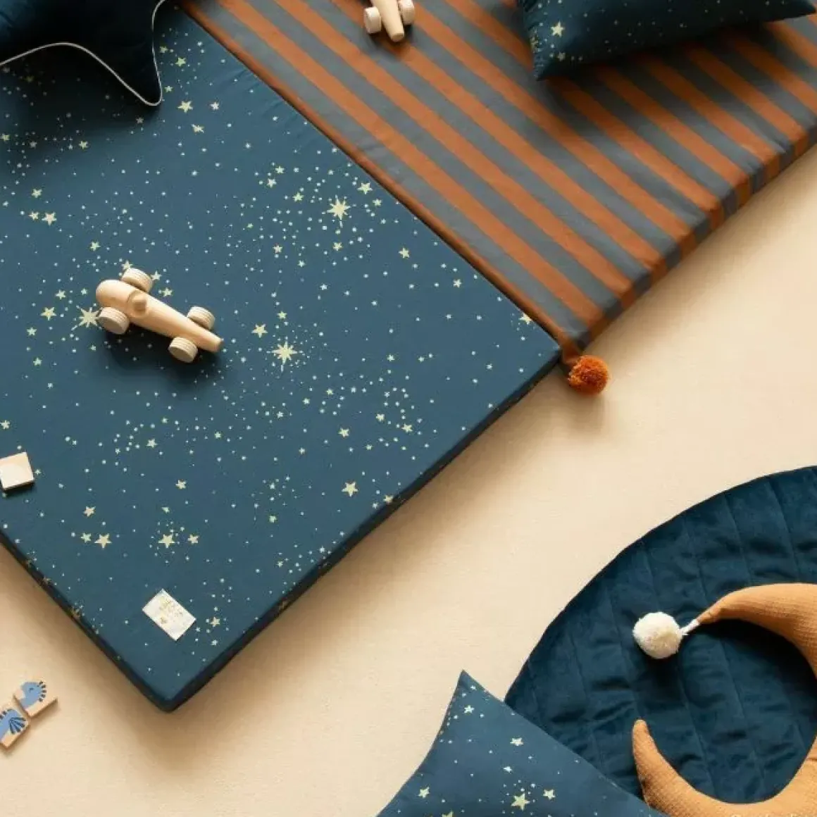 Play Time! Maak Koprollen Of Lees Rustig Een Boekje Op Dit Fijne Zachte Speelmatras Majestic Blue Brown Stripes Van Nobodinoz.