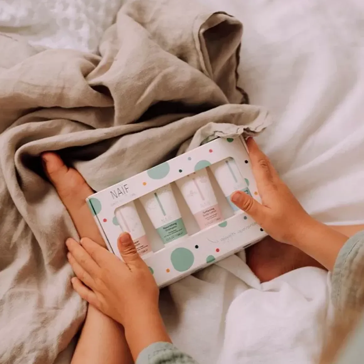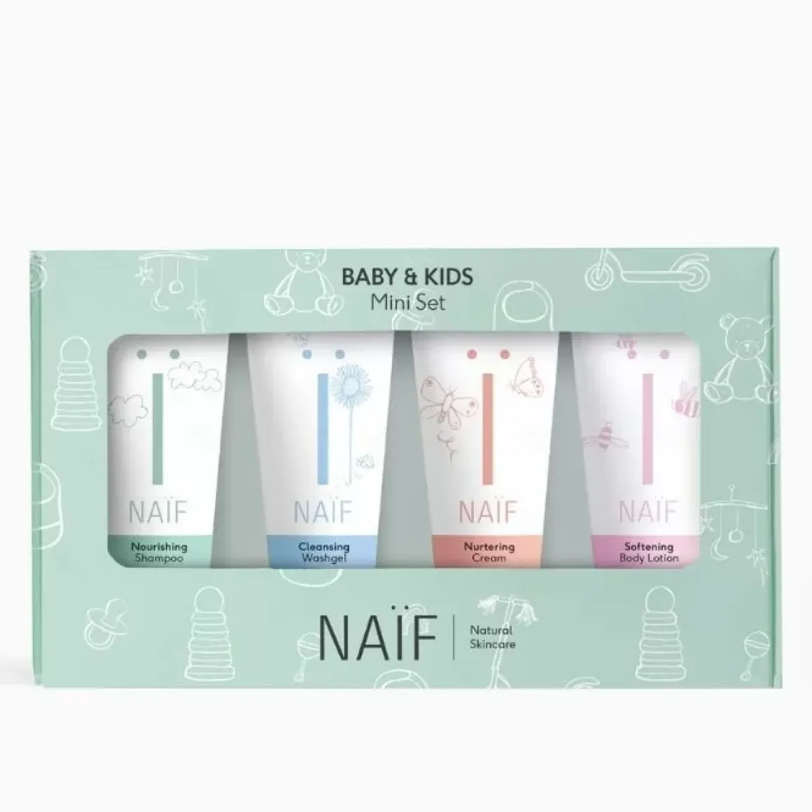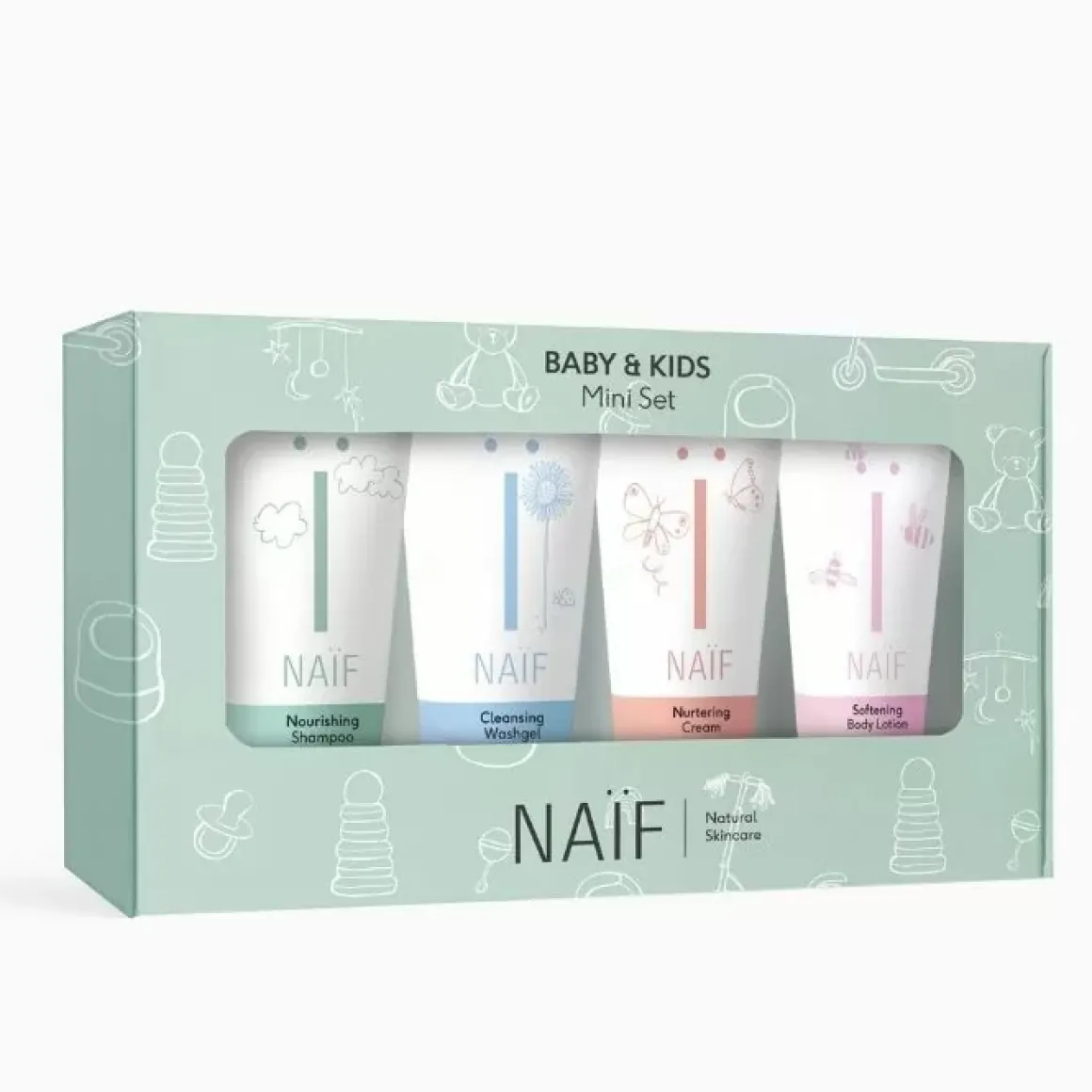 Maak Kennis Met De Producten Van Naïf! De Mini Set Van Naif Bevat 4 Mini’S Van De Fijnste Verzorgingsproducten Voor Je Baby. De Set Bevat Een Billencrème, Vette Crème, Wasgel En Een Shampoo.